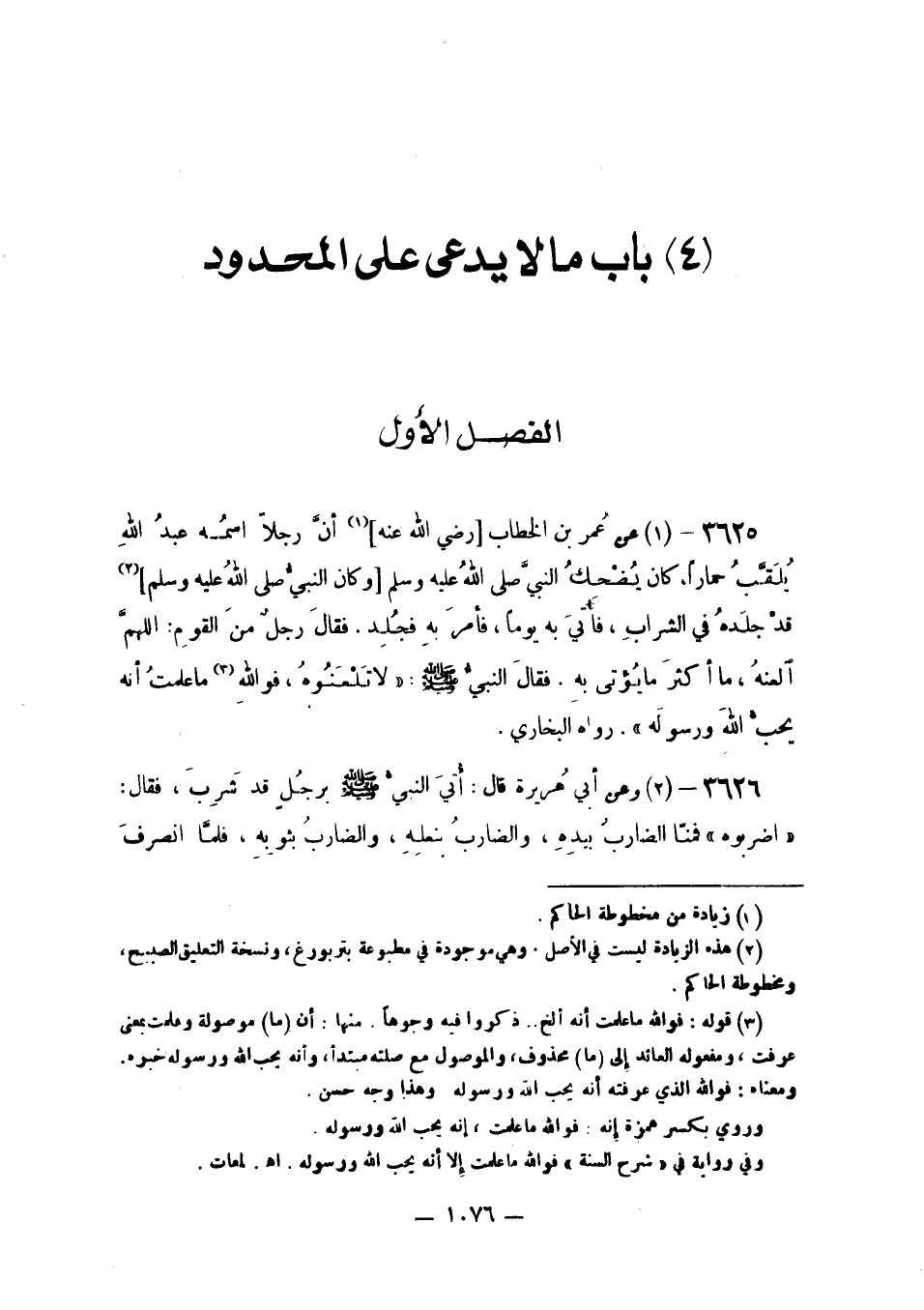 عَنْ عُمَرَ بْنِ الْخَطَّابِ رَضِيَ اللَّهُ عَنْهُ أنَّ رجلا اسمُه عبدُ اللَّهِ يُلَقَّبُ حمارا كَانَ يُضْحِكُ النَّبِيَّ صَلَّى اللَّهُ عَلَيْهِ وَسَلَّمَ وَكَانَ النَّبِيُّ صَلَّى اللَّهُ عَلَيْهِ وَسَلَّمَ قَدْ جَلَدَهُ فِي الشَّرَابِ فَأُتِيَ بِهِ يَوْمًا فَأَمَرَ بِهِ فَجُلِدَ فَقَالَ رَجُلٌ مِنَ الْقَوْمِ: اللَّهُمَّ الْعَنْهُ مَا أَكْثَرَ مَا يُؤْتَى بِهِ فَقَالَ النَّبِيُّ صَلَّى اللَّهُ عَلَيْهِ وَسَلَّمَ: «لَا تلعنوه فو الله مَا عَلِمْتُ أَنَّهُ يُحِبُّ اللَّهَ وَرَسُولَهُ» . رَوَاهُ البُخَارِيّ