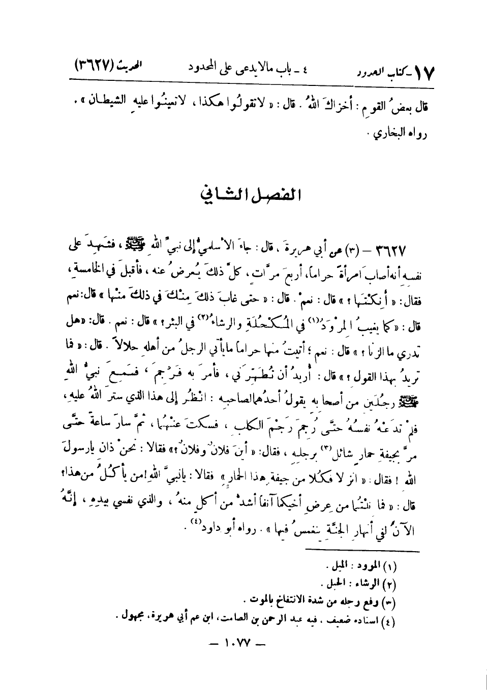 عَنْ أَبِي هُرَيْرَةَ قَالَ: جَاءَ الْأَسْلَمِيُّ إِلَى نَبِيِّ اللَّهِ صَلَّى اللَّهُ عَلَيْهِ وَسَلَّمَ فَشَهِدَ عَلَى نَفْسِهِ أَنَّهُ أَصَابَ امْرَأَةً حَرَامًا أَرْبَعَ مَرَّاتٍ كُلَّ ذَلِكَ يُعْرِضُ عَنْهُ فَأَقْبَلَ فِي الْخَامِسَةِ فَقَالَ: «أَنِكْتَهَا؟» قَالَ: نَعَمْ قَالَ: «حَتَّى غَابَ ذَلِكَ مِنْكَ فِي ذَلِكَ مِنْهَا» قَالَ: نَعَمْ قَالَ: «كَمَا يَغِيبُ الْمِرْوَدُ فِي الْمُكْحُلَةِ وَالرِّشَاءُ فِي الْبِئْرِ؟» قَالَ: نَعَمْ قَالَ: «هَلْ تَدْرِي مَا الزِّنَا؟» قَالَ: نَعَمْ أَتَيْتُ مِنْهَا حَرَامًا مَا يَأْتِي الرَّجُلُ مِنْ أَهْلِهِ حَلَالًا قَالَ: «فَمَا تُرِيدُ بِهَذَا الْقَوْلِ؟» قَالَ: أُرِيدُ أَنْ تُطَهِّرَنِي فَأَمَرَ بِهِ فَرُجِمَ فَسَمِعَ نَبِيُّ اللَّهِ صَلَّى اللَّهُ عَلَيْهِ وَسَلَّمَ رَجُلَيْنِ مِنْ أَصْحَابِهِ يَقُولُ أَحَدُهُمَا لِصَاحِبِهِ: انْظُرْ إِلَى هَذَا الَّذِي سَتَرَ اللَّهُ عَلَيْهِ فَلَمْ تَدَعْهُ نَفْسُهُ حَتَّى رُجِمَ رَجْمَ الْكَلْبِ فَسَكَتَ عَنْهُمَا ثُمَّ سَارَ سَاعَةً حَتَّى مَرَّ بِجِيفَةِ حِمَارٍ شَائِلٍ برجلِهِ فَقَالَ: «أينَ فلانٌ وفلانٌ؟» فَقَالَا: نَحْنُ ذَانِ يَا رَسُولَ اللَّهِ فَقَالَ: «انْزِلَا فَكُلَا مِنْ جِيفَةِ هَذَا الْحِمَارِ» فَقَالَا: يَا نَبِيَّ اللَّهِ مَنْ يَأْكُلُ مِنْ هَذَا؟ قَالَ: «فَمَا نِلْتُمَا مِنْ عَرْضِ أَخِيكُمَا آنِفًا أَشَدُّ مِنْ أَكْلٍ مِنْهُ وَالَّذِي نَفْسِي بِيَدِهِ إِنَّهُ الْآنَ لَفِي أنهارِ الجنَّةِ ينغمسُ فِيهَا» . رَوَاهُ أَبُو دَاوُد