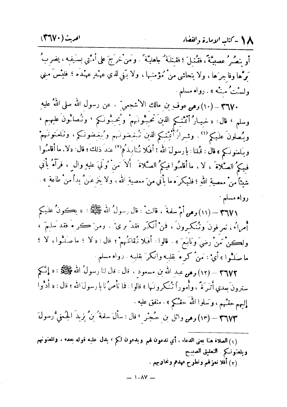 وَعَنْ عَوْفِ بْنِ مَالِكٍ الْأَشْجَعِيِّ عَنْ رَسُولِ اللَّهِ صَلَّى اللَّهُ عَلَيْهِ وَسَلَّمَ قَالَ: «خِيَارُ أئمتكم الَّذين يحبونهم وَيُحِبُّونَكُمْ وَتُصَلُّونَ عَلَيْهِمْ وَيُصَلُّونَ عَلَيْكُمْ وَشِرَارُ أَئِمَّتِكُمُ الَّذِي تبغضونهم ويبغضونكم وتلعنوهم ويلعنوكم» قَالَ: قُلْنَا: يَا رَسُولَ اللَّهِ أَفَلَا نُنَابِذُهُمْ عِنْدَ ذَلِكَ؟ قَالَ: «لَا مَا أَقَامُوا فِيكُمُ الصَّلَاةَ لَا مَا أَقَامُوا فِيكُمُ الصَّلَاةَ أَلَا مَنْ وُلِّيَ عَلَيْهِ وَالٍ فَرَآهُ يَأْتِي شَيْئًا مِنْ مَعْصِيَةِ اللَّهِ فَلْيَكْرَهْ مَا يَأْتِي مِنْ مَعْصِيَةِ اللَّهِ وَلَا يَنْزِعَنَّ يَدًا مِنْ طَاعَةٍ» . رَوَاهُ مُسلم