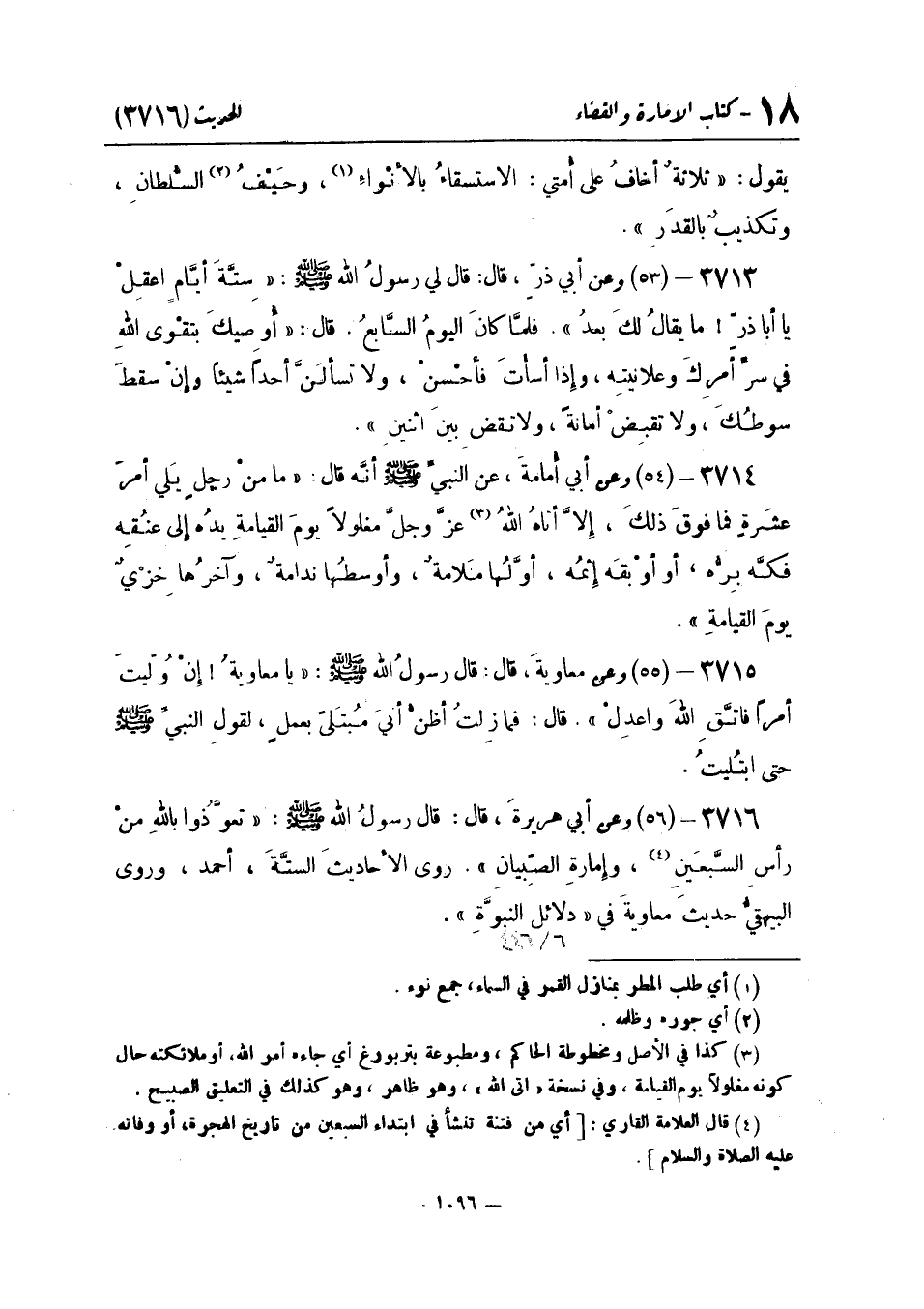 وَعَنْ مُعَاوِيَةَ قَالَ: قَالَ رَسُولُ اللَّهِ صَلَّى اللَّهُ عَلَيْهِ وَسَلَّمَ: «يَا مُعَاوِيَةُ إِنْ وُلِّيتَ أَمْرًا فَاتَّقِ اللَّهَ وَاعْدِلْ» . قَالَ: فَمَا زِلْتُ أَظُنُّ أَنِّي مُبْتَلًى بِعَمَلٍ لِقَوْلِ النَّبِيِّ صَلَّى الله عَلَيْهِ وَسلم حَتَّى ابْتليت