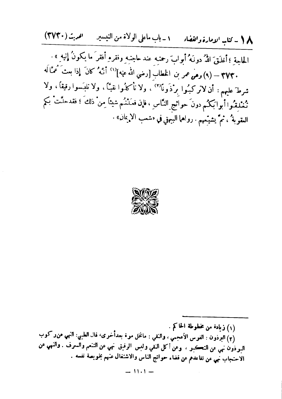 وَعَنْ عُمَرَ بْنِ الْخَطَّابِ رَضِيَ اللَّهُ عَنْهُ أَنَّهُ كَانَ إِذَا بَعَثَ عُمَّالَهُ شَرَطَ عَلَيْهِمْ: أَنْ لَا تَرْكَبُوا بِرْذَوْنًا وَلَا تَأْكُلُوا نَقِيًّا وَلَا تَلْبَسُوا رَقِيقًا وَلَا تُغْلِقُوا أَبْوَابَكُمْ دُونَ حَوَائِجِ النَّاسِ فَإِنْ فَعَلْتُمْ شَيْئًا مِنْ ذَلِكَ فَقَدْ حَلَّتْ بِكُمُ الْعُقُوبَةُ ثُمَّ يُشَيِّعُهُمْ. رَوَاهُمَا الْبَيْهَقِيُّ فِي شُعَبِ الْإِيمَانِ