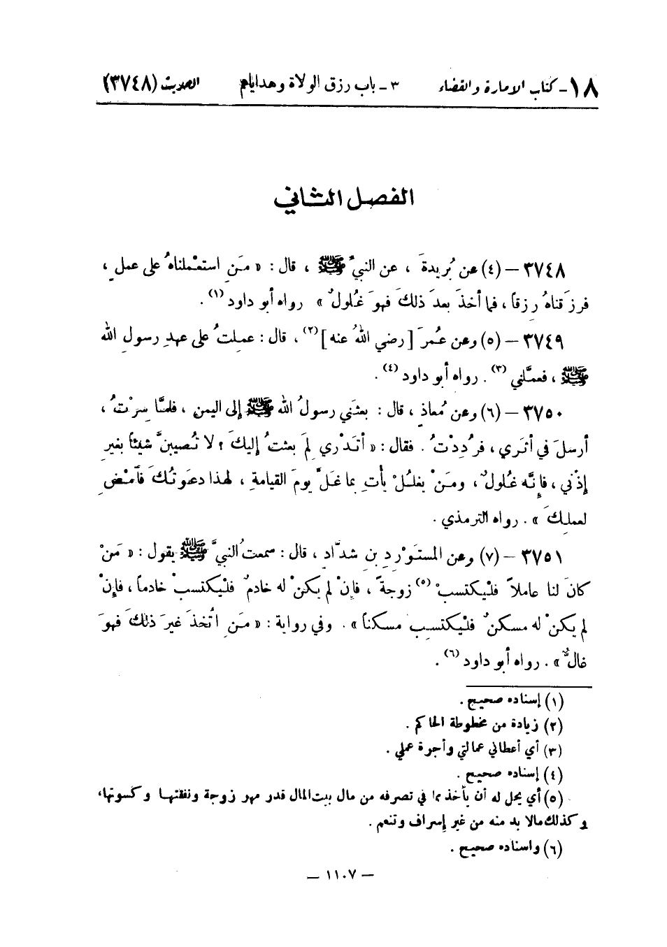 وَعَن المستَوْرِدِ بنِ شدَّادٍ قَالَ: سَمِعْتُ النَّبِيَّ صَلَّى اللَّهُ عَلَيْهِ وَسَلَّمَ يَقُولُ: «مَنْ كَانَ لَنَا عَامِلًا فَلْيَكْتَسِبْ زَوْجَةً فَإِنْ لَمْ يَكُنْ لَهُ خَادِمٌ فَلْيَكْتَسِبْ خَادِمًا فَإِنْ لَمْ يَكُنْ لَهُ مَسْكَنٌ فَلْيَكْتَسِبْ مَسْكَنًا» . وَفِي رِوَايَةٍ: «مَنِ اتَّخَذَ غَيْرَ ذَلِكَ فَهُوَ غالٌّ» . رَوَاهُ أَبُو دَاوُد