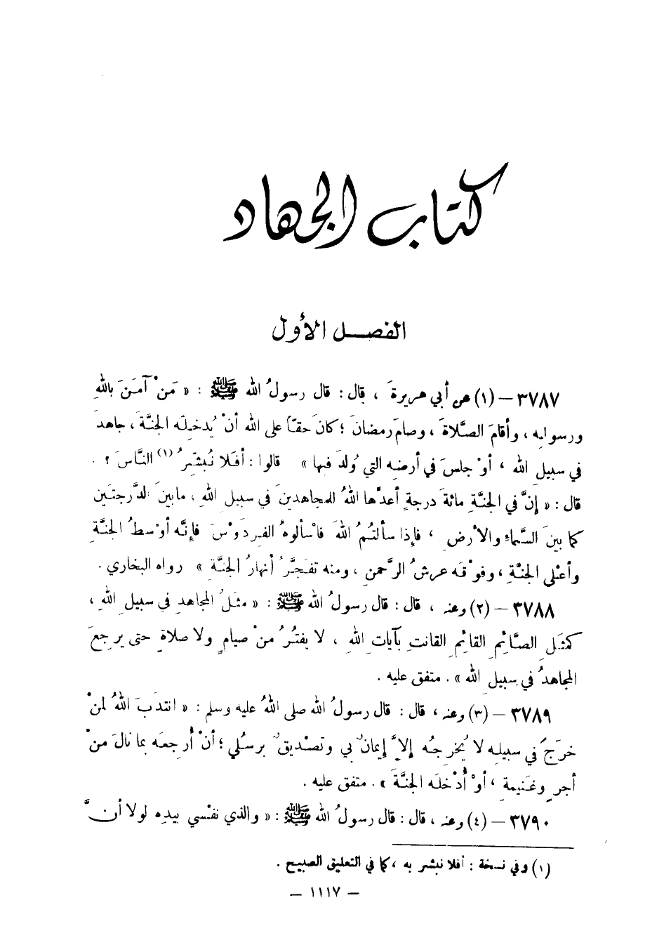 عَنْ أَبِي هُرَيْرَةَ قَالَ: قَالَ رَسُولُ اللَّهِ صَلَّى اللَّهُ عَلَيْهِ وَسَلَّمَ: «مَنْ آمَنَ بِاللَّهِ وَرَسُولِهِ وَأَقَامَ الصَّلَاةَ وَصَامَ رَمَضَانَ كَانَ حَقًّا عَلَى اللَّهِ أَنْ يُدْخِلَهُ الْجَنَّةَ جَاهَدَ فِي سهل اللَّهِ أَوْ جَلَسَ فِي أَرْضِهِ الَّتِي وُلِدَ فِيهَا» . قَالُوا: أفَلا نُبشِّرُ النَّاسَ؟ قَالَ: «إِنَّ فِي الْجَنَّةِ مِائَةَ دَرَجَةٍ أَعَدَّهَا اللَّهُ لِلْمُجَاهِدِينَ فِي سَبِيلِ اللَّهِ مَا بَيْنَ الدَّرَجَتَيْنِ كَمَا بَيْنَ السَّمَاءِ وَالْأَرْضِ فَإِذَا سَأَلْتُمُ اللَّهَ فَاسْأَلُوهُ الْفِرْدَوْسَ فَإِنَّهُ أَوْسَطُ الْجَنَّةِ وَأَعْلَى الْجَنَّةِ وَفَوْقَهُ عَرْشُ الرَّحْمَنِ وَمِنْهُ تُفَجَّرُ أنهارُ الجنَّةِ» . رَوَاهُ البُخَارِيّ