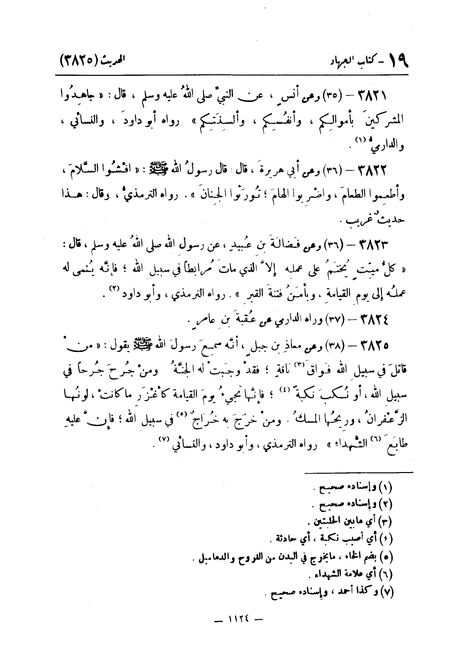 وَعَن معاذِ بن جبلٍ أَنَّهُ سَمِعَ رَسُولَ اللَّهِ صَلَّى اللَّهُ عَلَيْهِ وَسَلَّمَ يَقُولُ: «مَنْ قَاتَلَ فِي سَبِيلِ اللَّهِ فَوَاقَ نَاقَةٍ فَقَدْ وَجَبَتْ لَهُ الْجَنَّةُ وَمَنْ جُرِحَ جُرْحًا فِي سَبِيلِ اللَّهِ أَوْ نُكِبَ نَكْبَةً فَإِنَّهَا تَجِيءُ يَوْمَ الْقِيَامَةِ كَأَغْزَرِ مَا كَانَتْ لَوْنُهَا الزَّعْفَرَانُ وَرِيحُهَا الْمِسْكُ وَمَنْ خَرَجَ بِهِ خُرَاجٌ فِي سَبِيلِ اللَّهِ فَإِنَّ عَلَيْهِ طَابَعُ الشُّهَدَاءِ» . رَوَاهُ التِّرْمِذِيُّ وَأَبُو دَاوُدَ وَالنَّسَائِيُّ