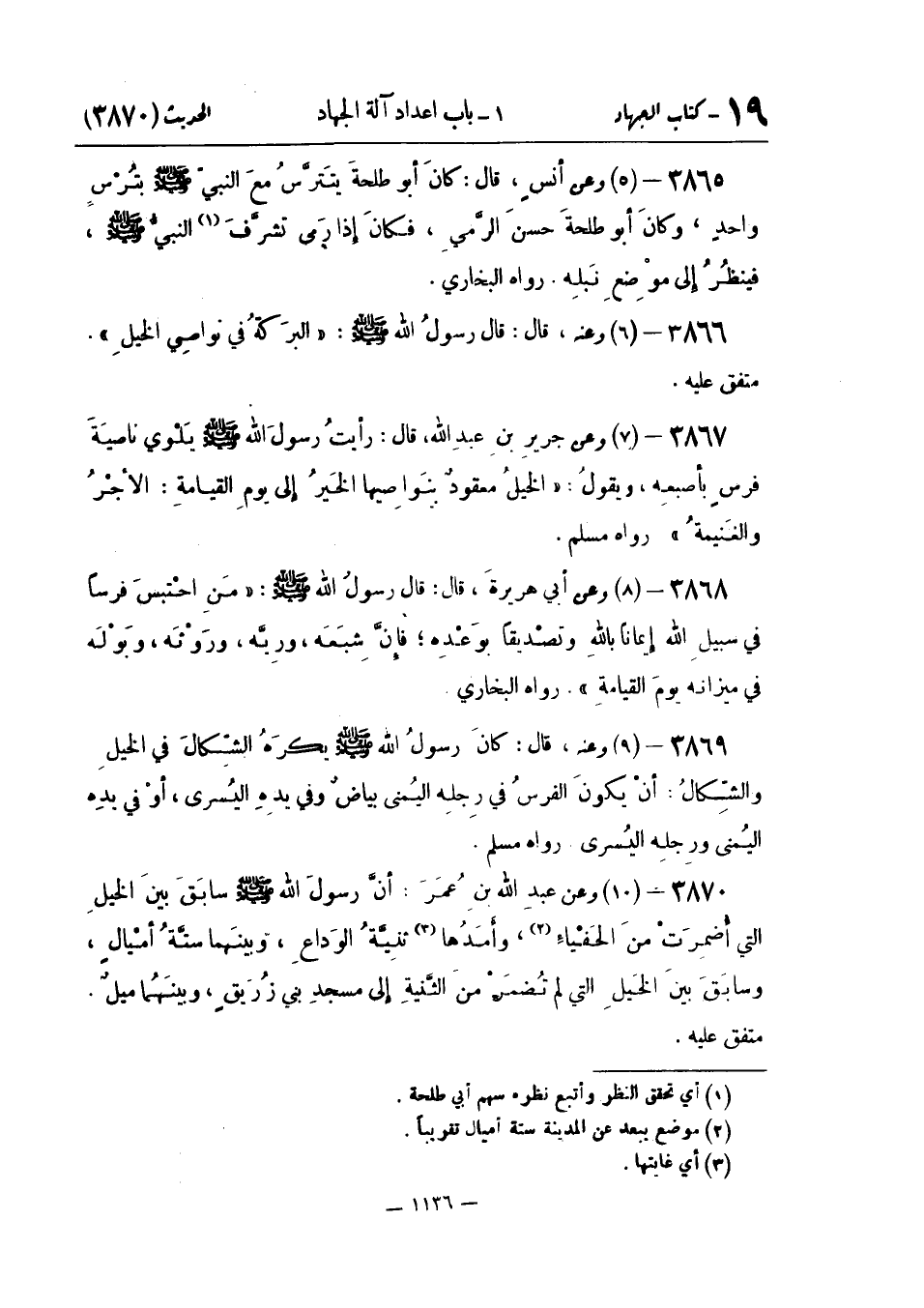 وَعَن جَرِيرِ بْنِ عَبْدِ اللَّهِ قَالَ: رَأَيْتُ رَسُولَ اللَّهِ صَلَّى اللَّهُ عَلَيْهِ وَسَلَّمَ يَلْوِي نَاصِيَةَ فرسٍ بأصبعِه ويقولُ: " الْخَيْلُ مَعْقُودٌ بِنَوَاصِيهَا الْخَيْرُ إِلَى يَوْمِ الْقِيَامَةِ: الأجْرُ والغَنيمةُ ". رَوَاهُ مُسلم