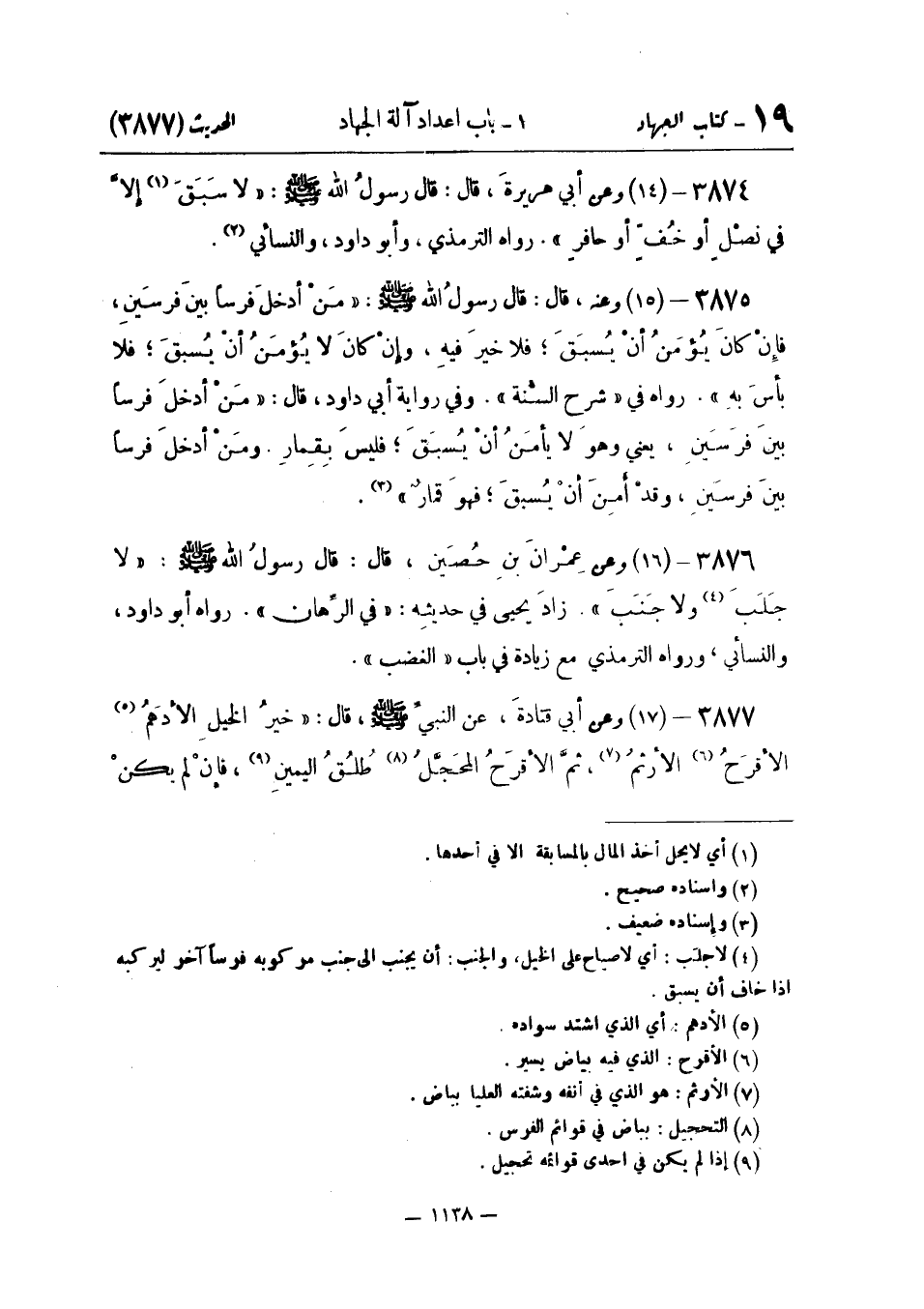 وَعَنْ أَبِي هُرَيْرَةَ قَالَ: قَالَ رَسُولُ اللَّهِ صَلَّى اللَّهُ عَلَيْهِ وَسَلَّمَ: «لَا سَبَقَ إِلَّا فِي نَصْلٍ أَوْ خُفٍّ أَوْ حَافِرٍ» . رَوَاهُ التِّرْمِذِيّ وَأَبُو دَاوُد وَالنَّسَائِيّ
