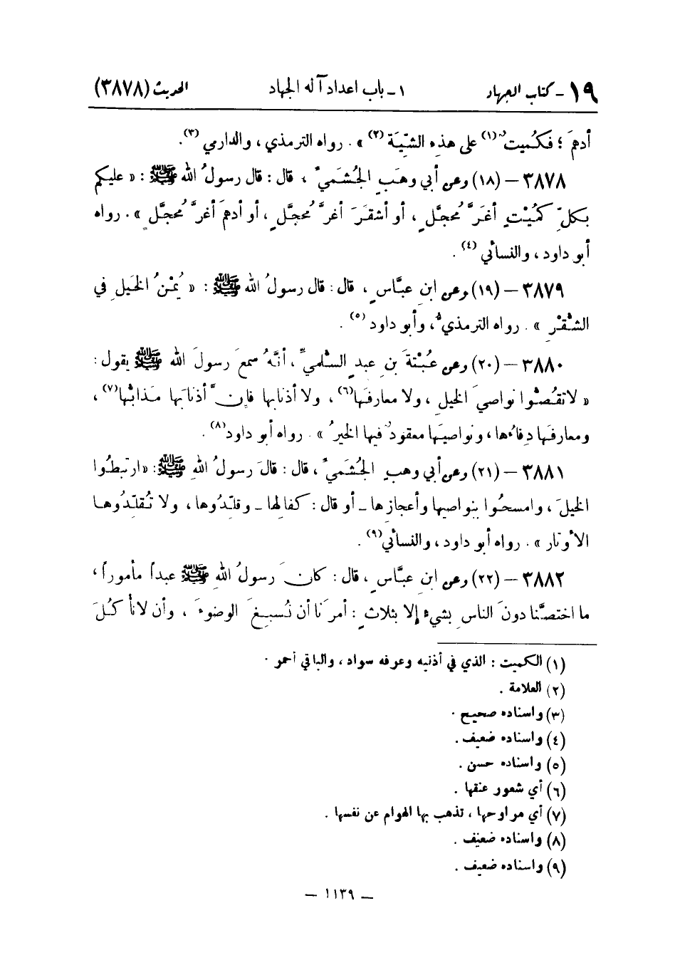 وَعَن عُتبةَ بن عبدٍ السُّلميِّ أَنَّهُ سَمِعَ رَسُولَ اللَّهِ صَلَّى اللَّهُ عَلَيْهِ وَسَلَّمَ يَقُولُ: «لَا تَقُصُّوا نَوَاصِيَ الْخَيْلِ وَلَا مَعَارِفَهَا وَلَا أَذْنَابَهَا فَإِنَّ أَذْنَابَهَا مَذَابُّهَا وَمَعَارِفَهَا دِفاءُها وَنَوَاصِيهَا مَعْقُودٌ فِيهَا الْخَيْرُ» . رَوَاهُ أَبُو دَاوُدَ