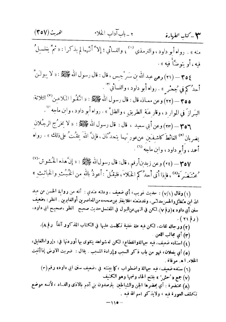 وَعَنْ زَيْدِ بْنِ أَرْقَمَ قَالَ: قَالَ رَسُولُ اللَّهِ صَلَّى اللَّهُ عَلَيْهِ وَسَلَّمَ: " إِنَّ هَذِهِ الْحُشُوشَ مُحْتَضَرَةٌ فَإِذَا أَتَى أَحَدُكُمُ الْخَلَاءَ فَلْيَقُلْ: أَعُوذُ بِاللَّهِ مِنَ الْخُبْثِ والخبائث ". -[116]- رَوَاهُ أَبُو دَاوُد وَابْن مَاجَه