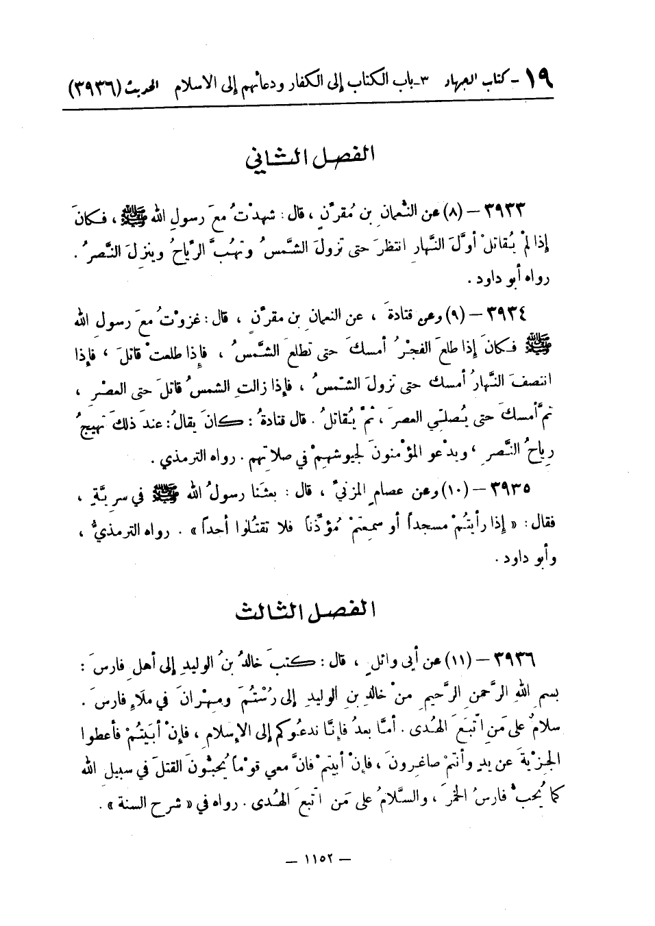 عَن أبي وائلٍ قَالَ: كَتَبَ خَالِدُ بْنُ الْوَلِيدِ إِلَى أَهْلِ فَارِسَ: بِسْمِ اللَّهِ الرَّحْمَنِ الرَّحِيمِ مِنْ خَالِدِ بْنِ الْوَلِيدِ إِلَى رُسْتَمَ وَمِهْرَانَ فِي مَلَأِ فَارِسَ. سَلَامٌ عَلَى مَنِ اتَّبَعَ الْهُدَى. أَمَّا بَعْدُ فَإِنَّا نَدْعُوكُمْ إِلَى الْإِسْلَامِ فَإِنْ أَبَيْتُمْ فَأَعْطُوا الْجِزْيَةَ عَنْ يَدٍ وَأَنْتُمْ صَاغِرُونَ فَإِنْ أَبَيْتُمْ فَإِنَّ مَعِيَ قَوْمًا يُحِبُّونَ الْقَتْلَ فِي سَبِيلِ اللَّهِ كَمَا يُحِبُّ فَارِسُ الْخَمْرَ وَالسَّلَامُ عَلَى مَنِ اتَّبَعَ الْهُدَى. رَوَاهُ فِي شَرْحِ السّنة 0