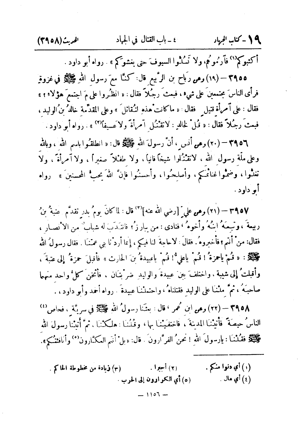 وَعَن رَبَاح بن الرَّبيعِ قَالَ: كُنَّا مَعَ رَسُولِ اللَّهِ صَلَّى اللَّهُ عَلَيْهِ وَسَلَّمَ فِي غزوةٍ فَرَأى الناسَ مجتمعينَ عَلَى شَيْءٍ فَبَعَثَ رَجُلًا فَقَالَ: «انْظُرُوا عَلَى من اجْتمع هَؤُلَاءِ؟» فَقَالَ: عَلَى امْرَأَةٍ قَتِيلٍ فَقَالَ: «مَا كَانَتْ هَذِهِ لِتُقَاتِلَ» وَعَلَى الْمُقَدِّمَةِ خَالِدُ بْنُ الْوَلِيدِ فَبَعَثَ رَجُلًا فَقَالَ: " قُلْ لِخَالِدٍ: لَا تَقْتُلِ امْرَأَة وَلَا عسيفا ". رَوَاهُ أَبُو دَاوُد