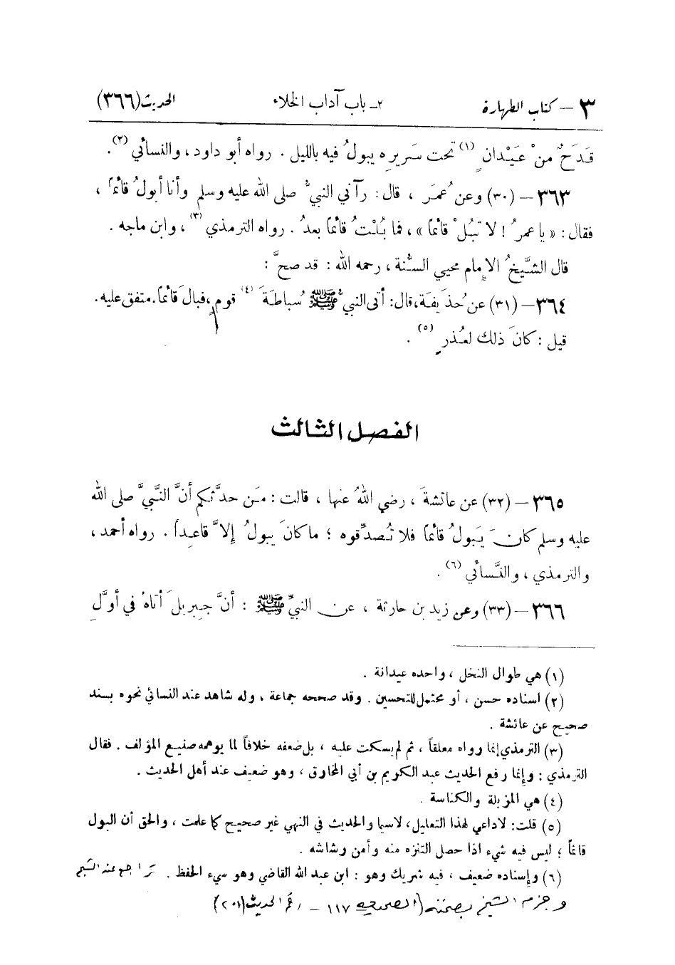 عَنْ عَائِشَةَ رَضِيَ اللَّهُ عَنْهَا قَالَتْ: «مَنْ حَدَّثَكُمْ أَنَّ النَّبِيَّ صَلَّى اللَّهُ عَلَيْهِ وَسَلَّمَ كَانَ يَبُولُ قَائِمًا فَلَا تُصَدِّقُوهُ مَا كَانَ يَبُول إِلَّا قَاعِدا» . رَوَاهُ أَحْمد وَالتِّرْمِذِيّ وَالنَّسَائِيّ