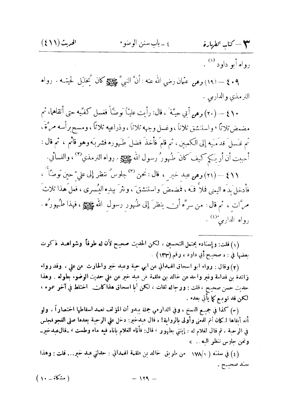 وَعَنْ عَبْدِ خَيْرٍ قَالَ: نَحْنُ جُلُوسٌ نَنْظُرُ إِلَى عَلِيٍّ حِينَ تَوَضَّأَ فَأَدْخَلَ يَدَهُ الْيُمْنَى فَمَلَأَ فَمَهُ فَمَضْمَضَ وَاسْتَنْشَقَ وَنَثَرَ بِيَدِهِ الْيُسْرَى فَعَلَ هَذَا ثَلَاثَ مَرَّاتٍ ثُمَّ قَالَ مَنْ سَرَّهُ أَنْ يَنْظُرَ إِلَى طَهُورِ رَسُولِ اللَّهِ صَلَّى اللَّهُ عَلَيْهِ وَسَلَّمَ فَهَذَا طَهُورُهُ. رَوَاهُ الدَّارمِيّ