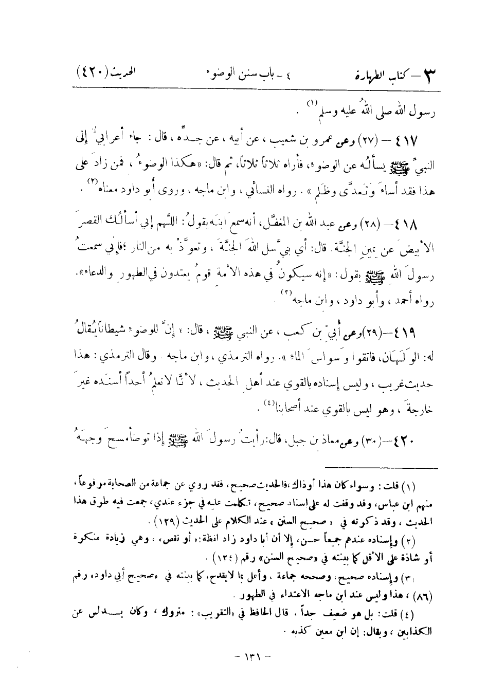 وَعَنْ عَمْرِو بْنِ شُعَيْبٍ عَنْ أَبِيهِ عَنْ جده قَالَ: جَاءَ أَعْرَابِيٌّ إِلَى النَّبِيِّ صَلَّى اللَّهُ عَلَيْهِ وَسَلَّمَ يَسْأَلُهُ عَنِ الْوُضُوءِ فَأَرَاهُ ثَلَاثًا ثَلَاثًا ثُمَّ قَالَ: «هَكَذَا الْوُضُوءُ فَمَنْ زَادَ عَلَى هَذَا فَقَدْ أَسَاءَ وَتَعَدَّى وَظَلَمَ» . رَوَاهُ النَّسَائِيُّ وَابْنُ مَاجَهْ وَرَوَى أَبُو دَاوُدَ مَعْنَاهُ