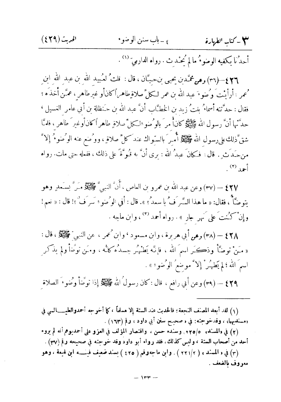 وَعَن مُحَمَّد بن يحيى بن حبَان الْأنْصَارِيّ ثمَّ الْمَازِني مَازِن بني النجار عَن عُبَيْدِ اللَّهِ بْنِ عَبْدِ اللَّهِ بْنِ عُمَرَ قَالَ قلت لَهُ أَرَأَيْتَ وُضُوءَ عَبْدِ اللَّهِ بْنِ عُمَرَ لِكُلِّ صَلَاةٍ طَاهِرًا كَانَ أَوْ غَيْرَ طَاهِرٍ عَمَّنْ أَخَذَهُ؟ فَقَالَ: حَدَّثَتْهُ أَسْمَاءُ بِنْتُ زَيْدِ بْنِ الْخَطَّابِ أَنَّ عَبْدَ اللَّهِ بْنَ حَنْظَلَةَ بْنِ أبي عَامر ابْن الْغَسِيلِ حَدَّثَهَا أَنَّ رَسُولَ اللَّهِ صَلَّى اللَّهُ عَلَيْهِ وَسَلَّمَ كَانَ أُمِرَ بِالْوُضُوءِ لِكُلِّ صَلَاةٍ طَاهِرًا كَانَ أَوْ غَيْرَ طَاهِرٍ فَلَمَّا شَقَّ ذَلِكَ عَلَى رَسُولِ اللَّهِ صَلَّى اللَّهُ عَلَيْهِ وَسَلَّمَ أُمِرَ بِالسِّوَاكِ عِنْدَ كُلِّ صَلَاةٍ وَوُضِعَ عَنْهُ الْوُضُوءُ إِلَّا مِنْ حَدَثٍ قَالَ فَكَانَ عَبْدُ اللَّهِ يَرَى أَنَّ بِهِ قُوَّةً عَلَى ذَلِكَ كَانَ يَفْعَله حَتَّى مَاتَ. رَوَاهُ أَحْمد