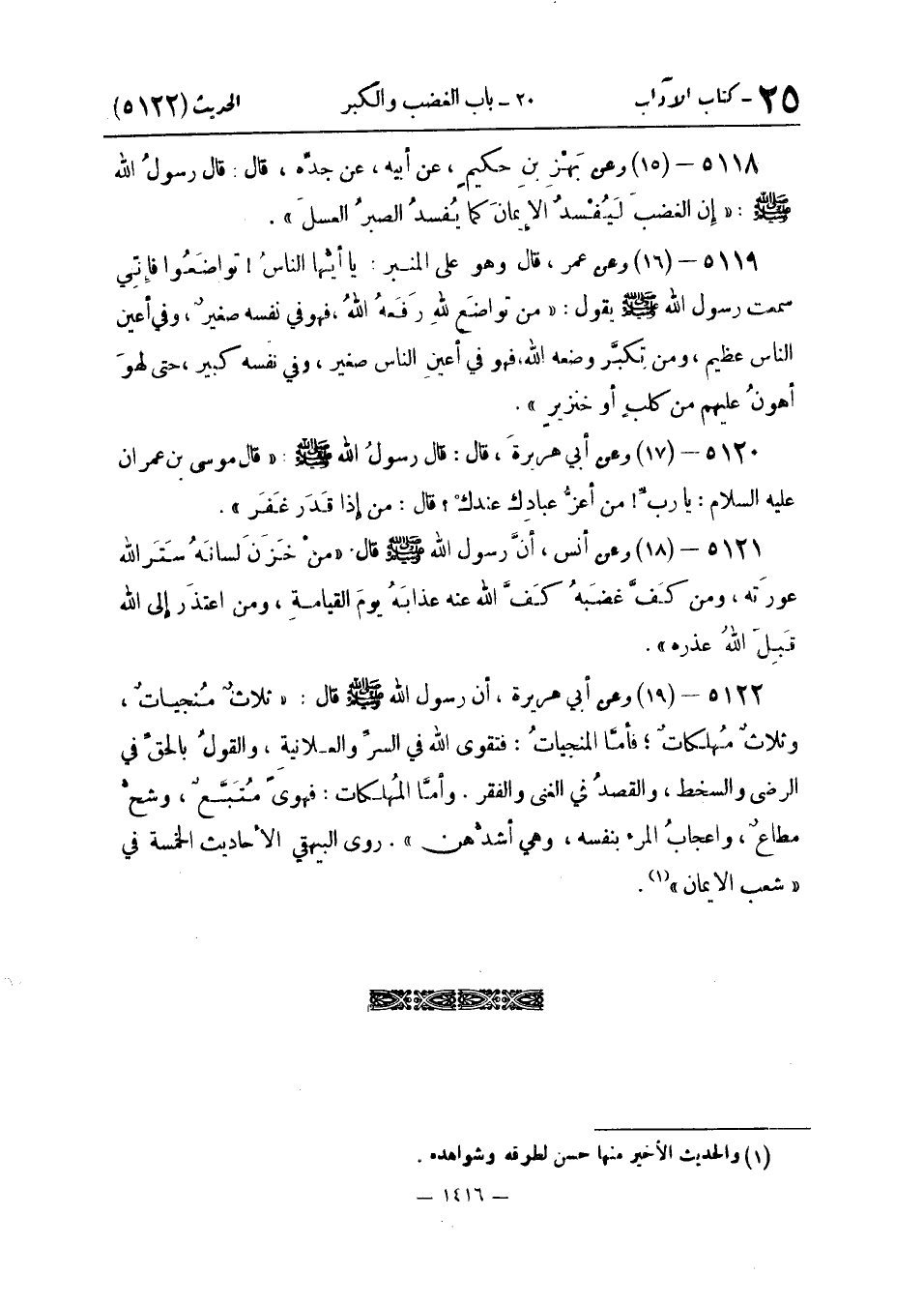 وَعَنْ أَبِي هُرَيْرَةَ أَنَّ رَسُولَ اللَّهِ صَلَّى اللَّهُ عَلَيْهِ وَسَلَّمَ قَالَ: " ثَلَاثٌ مُنْجِيَاتٌ وَثَلَاثٌ مُهْلِكَاتٌ فَأَمَّا الْمُنْجِيَاتُ: فَتَقْوَى اللَّهِ فِي السِّرِّ والعلانيةِ والقولُ بالحقِّ فِي الرضى وَالسُّخْطِ وَالْقَصْدُ فِي الْغِنَى وَالْفَقْرِ. وَأَمَّا الْمُهْلِكَاتُ: فَهَوًى مُتَّبَعٌ وَشُحٌّ مُطَاعٌ وَإِعْجَابُ الْمَرْءِ بِنَفْسِهِ وَهِيَ أَشَدُّهُنَّ «. رَوَى الْبَيْهَقِيُّ الْأَحَادِيثَ الْخَمْسَةَ فِي» شعب الْإِيمَان "