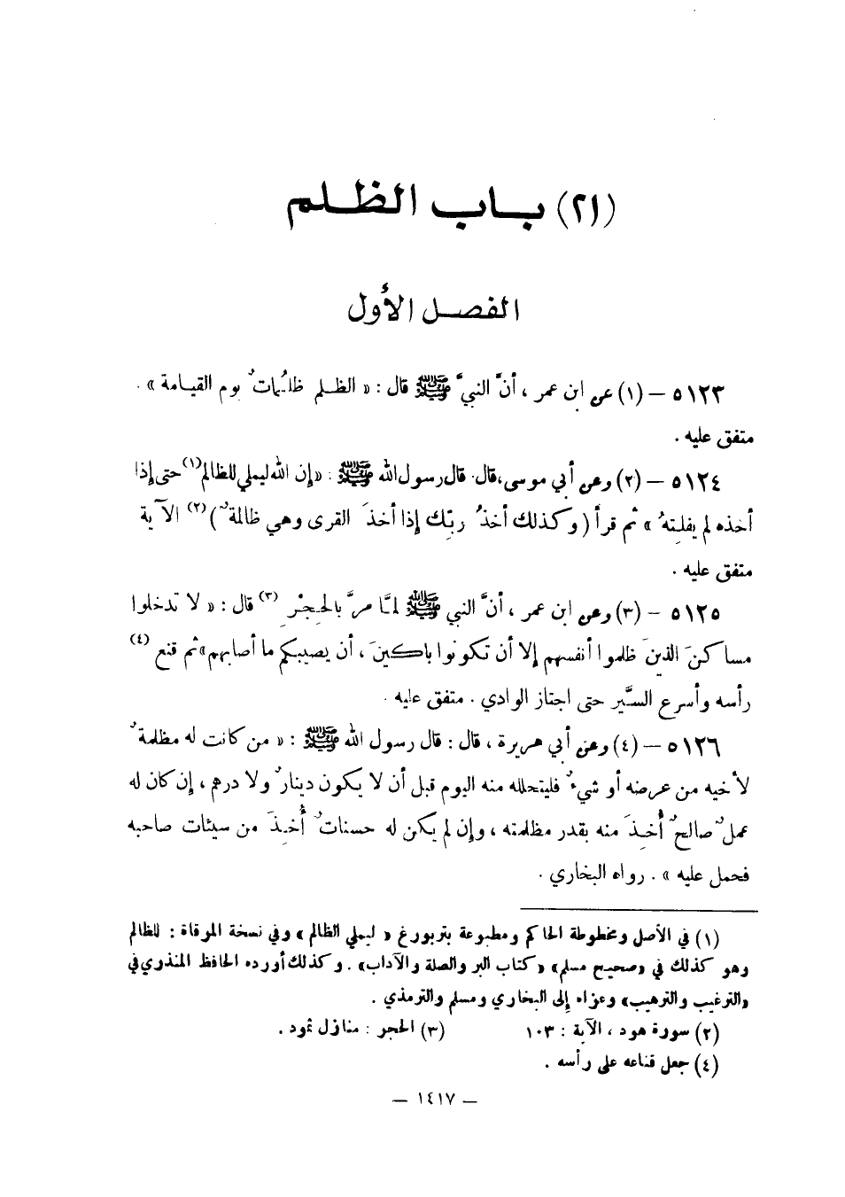 عَنِ ابْنِ عُمَرَ أَنَّ النَّبِيَّ صَلَّى اللَّهُ عَلَيْهِ وَسَلَّمَ قَالَ: «الظُّلْمُ ظُلْمَاتٌ يَوْمَ الْقِيَامَةِ» . مُتَّفق عَلَيْهِ