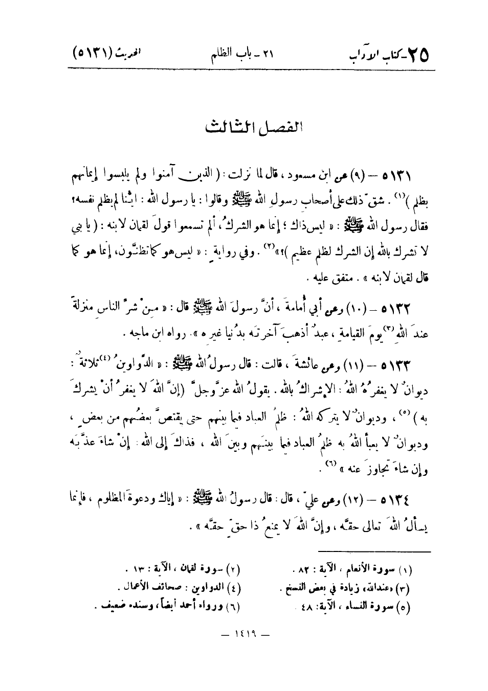 عَن ابْن مَسْعُود قَالَ: لَمَّا نَزَلَتْ: (الَّذِينَ آمَنُوا وَلَمْ يَلْبِسُوا إِيمانهم بظُلْم)