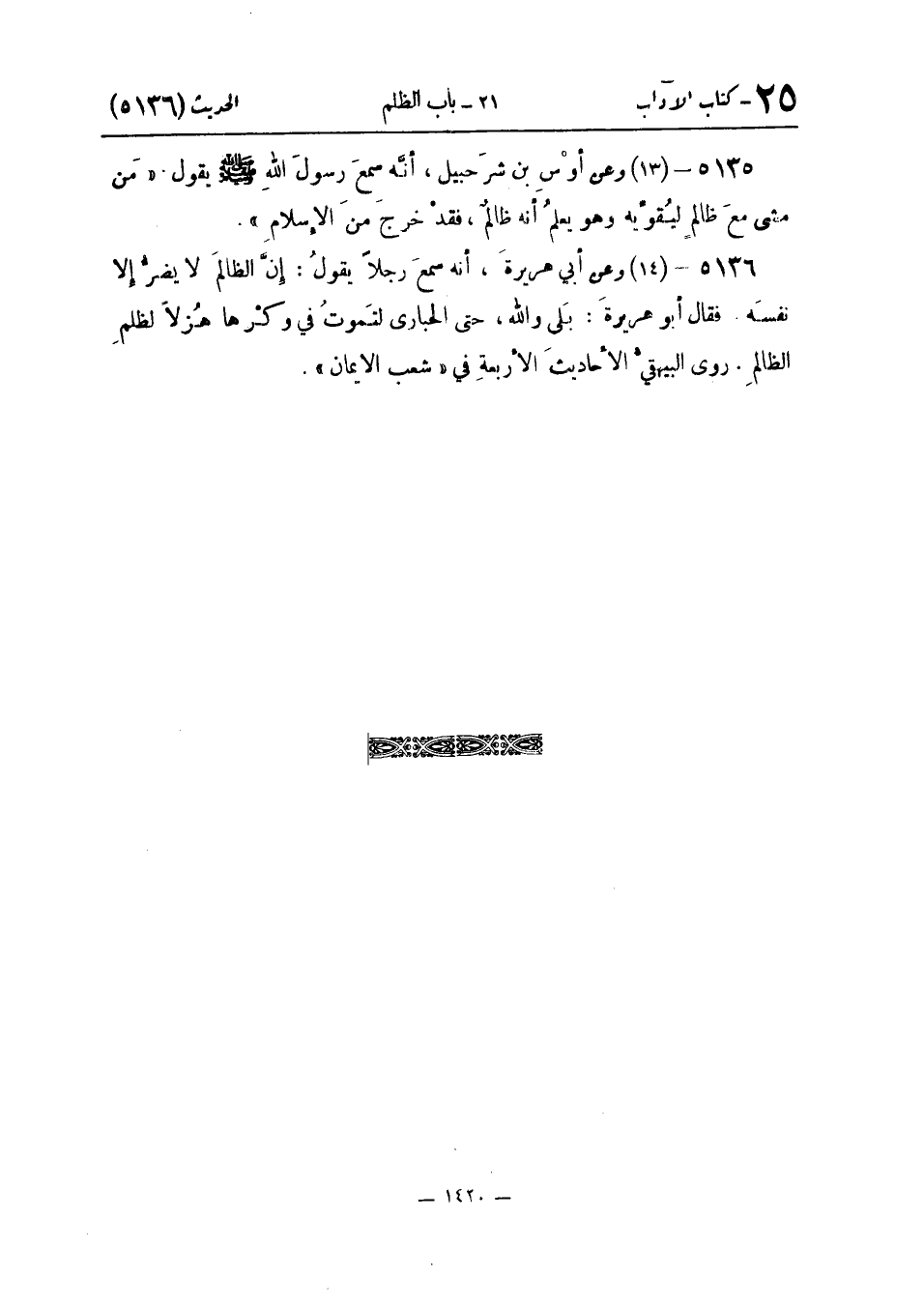 هُرَيْرَةَ أَنَّهُ سَمِعَ رَجُلًا يَقُولُ: إِنَّ الظَّالِمَ لَا يَضُرُّ إِلَّا نَفْسَهُ فَقَالَ أَبُو هُرَيْرَةَ: بَلَى وَاللَّهِ حَتَّى الْحُبَارَى لَتَمُوتُ فِي وَكْرِهَا هُزْلًا لِظُلْمِ الظَّالِمِ. رَوَى الْبَيْهَقِيُّ الْأَحَادِيثَ الْأَرْبَعَةَ فِي «شُعَبِ الْإِيمَانِ»