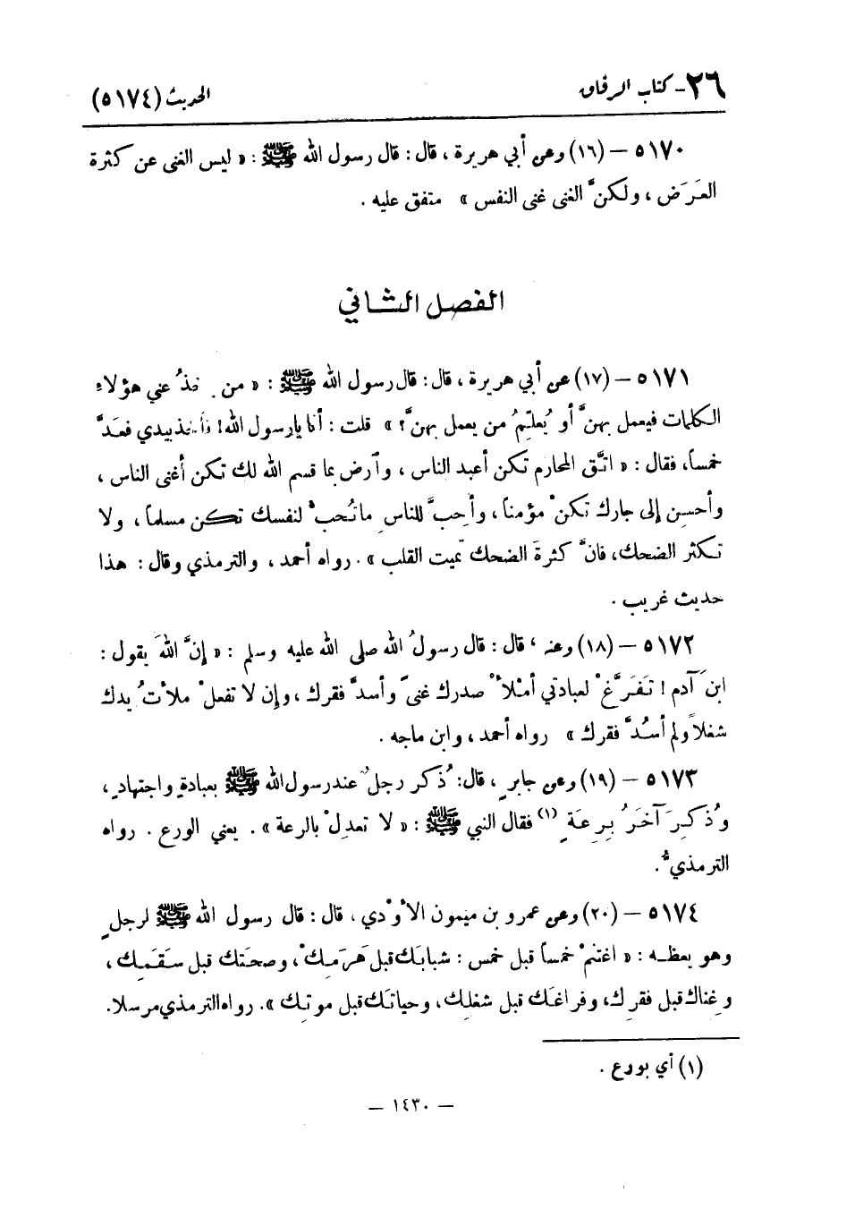 هُرَيْرَةَ قَالَ: قَالَ رَسُولُ اللَّهِ صَلَّى الله عَلَيْهِ وَسلم: «من أَخذ عَنِّي هَؤُلَاءِ الْكَلِمَاتِ فَيَعْمَلُ بِهِنَّ أَوْ يُعَلِّمُ مَنْ يَعْمَلُ بِهِنَّ؟» قُلْتُ: أَنَا يَا رَسُولَ الله فَأخذ بيَدي فَعَدَّ خَمْسًا فَقَالَ: «اتَّقِ الْمَحَارِمَ تَكُنْ أَعْبَدَ النَّاسِ وَارْضَ بِمَا قَسَمَ اللَّهُ لَكَ تَكُنْ أَغْنَى النَّاسِ وَأَحْسِنْ إِلَى جَارِكَ تَكُنْ مُؤْمِنًا وَأَحِبَّ لِلنَّاسِ مَا تُحِبُّ لِنَفْسِكَ تَكُنْ مُسْلِمًا وَلَا تُكْثِرِ الضَّحِكَ فَإِنَّ كَثْرَةَ الضَّحِكَ تُمِيتُ الْقَلْبَ» . رَوَاهُ أَحْمَدُ وَالتِّرْمِذِيُّ وَقَالَ: هَذَا حَدِيثٌ غَرِيبٌ