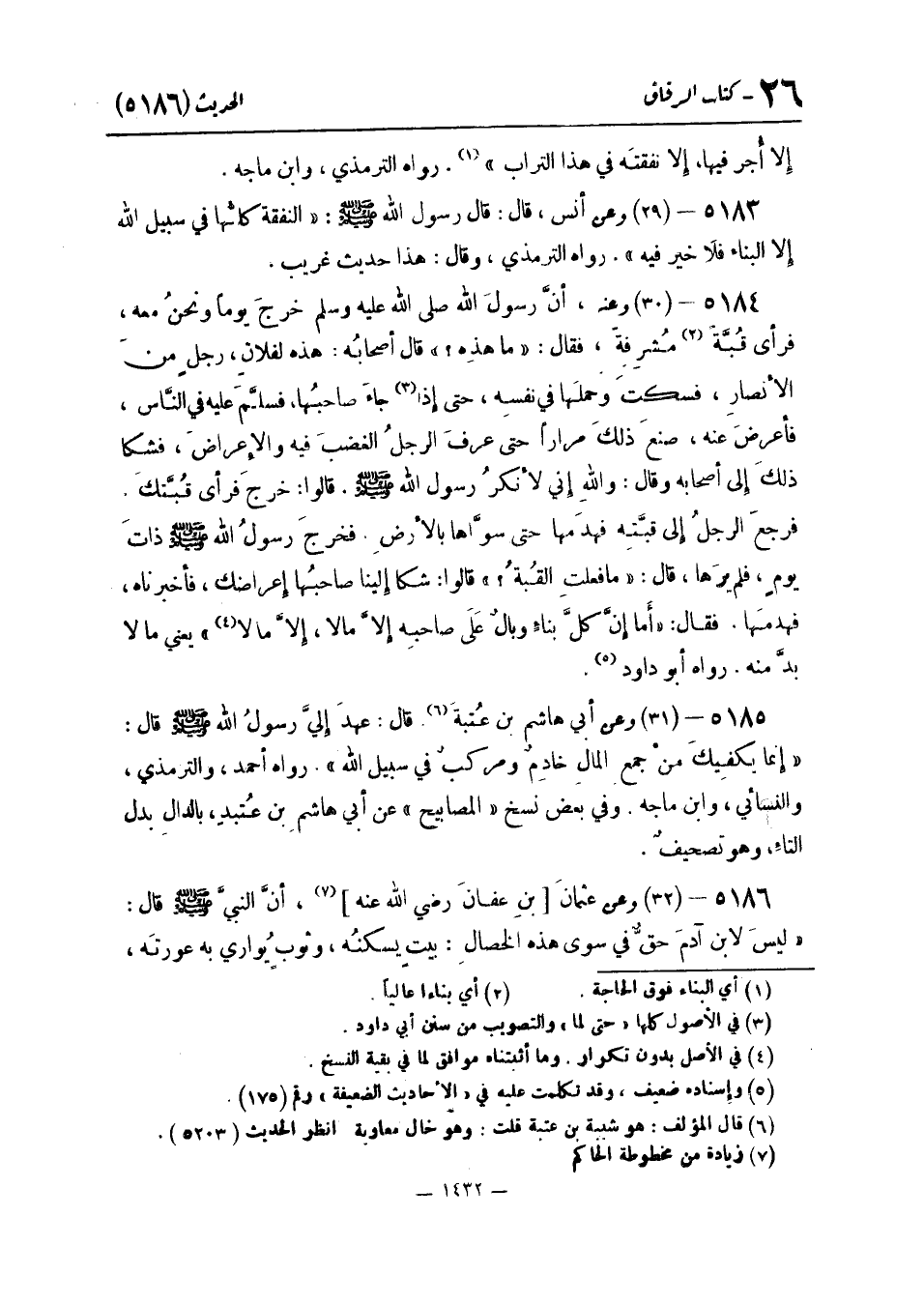 قَالَ: قَالَ رَسُولُ اللَّهِ صَلَّى اللَّهُ عَلَيْهِ وَسَلَّمَ: «النَّفَقَةُ كُلُّهَا فِي سَبِيلِ اللَّهِ إِلَّا الْبِنَاءَ فَلَا خَيْرَ فِيهِ» . رَوَاهُ التِّرْمِذِيُّ وَقَالَ: هَذَا حَدِيثٌ غَرِيبٌ