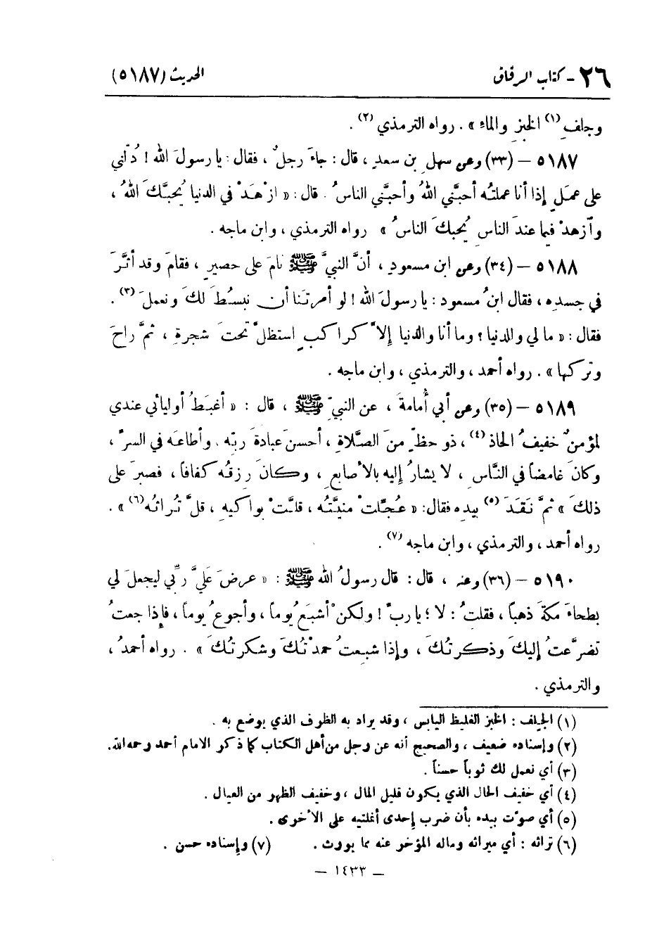 مَسْعُودٍ أَنَّ النَّبِيَّ صَلَّى اللَّهُ عَلَيْهِ وَسَلَّمَ نَامَ عَلَى حَصِيرٍ فَقَامَ وَقَدْ أَثَّرَ فِي جَسَدِهِ فَقَالَ ابْنُ مَسْعُودٍ: يَا رَسُولَ اللَّهِ لَوْ أَمَرْتَنَا أَنْ نَبْسُطَ لَكَ وَنَعْمَلَ. فَقَالَ: «مَا لِي وَلِلدُّنْيَا؟ وَمَا أَنَا وَالدُّنْيَا إِلَّا كَرَاكِبٍ اسْتَظَلَّ تَحْتَ شَجَرَةٍ ثُمَّ رَاحَ وَتَرَكَهَا» . رَوَاهُ أَحْمَدُ وَالتِّرْمِذِيُّ وَابْن مَاجَه