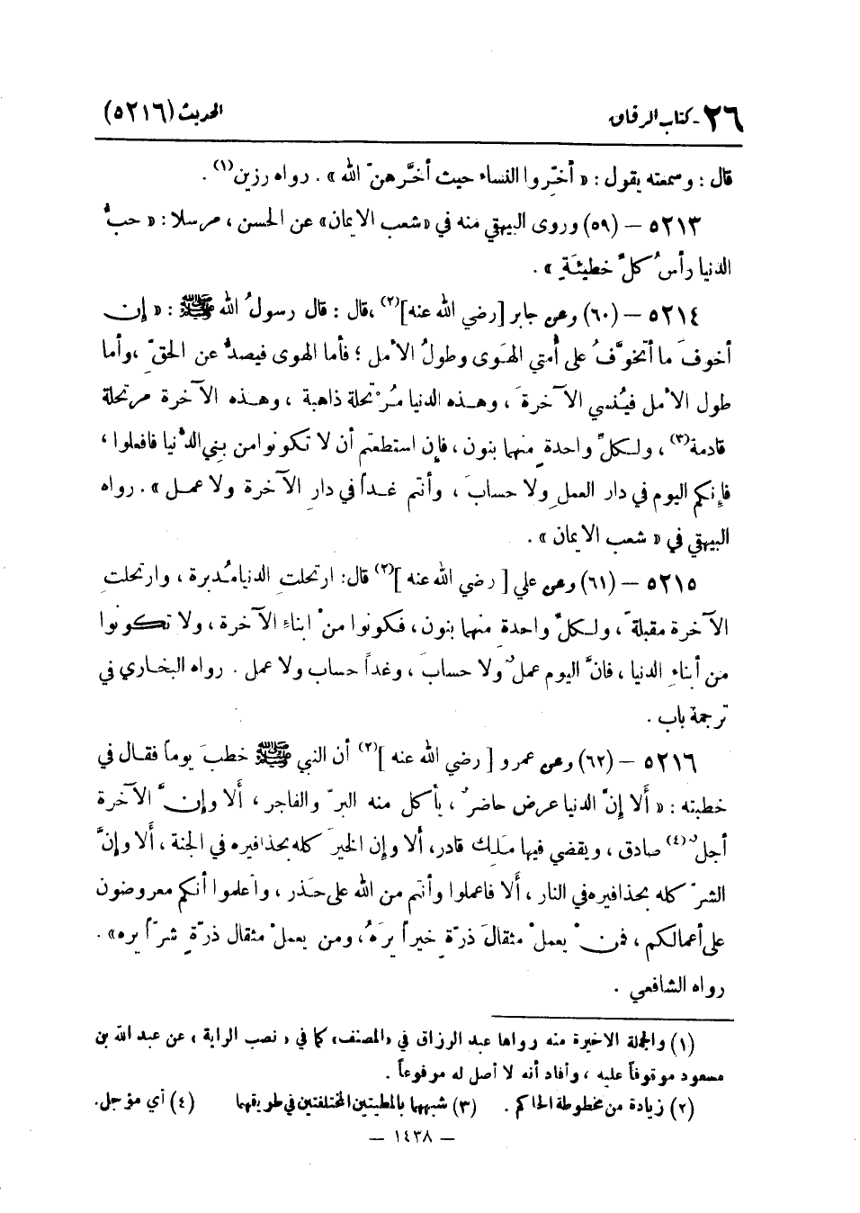 رَضِيَ اللَّهُ عَنْهُ أَنَّ النَّبِيَّ صَلَّى اللَّهُ عَلَيْهِ وَسَلَّمَ خَطَبَ يَوْمًا فَقَالَ فِي خُطْبَتِهِ: «أَلَا إِنَّ الدُّنْيَا عَرَضٌ حَاضِرٌ يَأْكُلُ مِنْهُ الْبَرُّ وَالْفَاجِرُ أَلا وَإِن الآحرة أَجَلٌ صَادِقٌ وَيَقْضِي فِيهَا مَلِكٌ قَادِرٌ أَلَا وَإِنَّ الْخَيْرَ كُلَّهُ بِحَذَافِيرِهِ فِي الْجَنَّةِ أَلَا وَإِنَّ الشَّرَّ كُلَّهُ بِحَذَافِيرِهِ فِي النَّارِ أَلَا فَاعْمَلُوا وَأَنْتُمْ مِنَ اللَّهِ عَلَى حَذَرٍ وَاعْلَمُوا أَنَّكُمْ مَعْرُوضُونَ عَلَى أَعْمَالِكُمْ فَمَنْ يَعْمَلْ مِثْقَالَ ذَرَّةٍ خَيْرًا يَرَهُ وَمَنْ يَعْمَلْ مِثْقَالَ ذَرَّةٍ شرا يره» . للشَّافِعِيّ