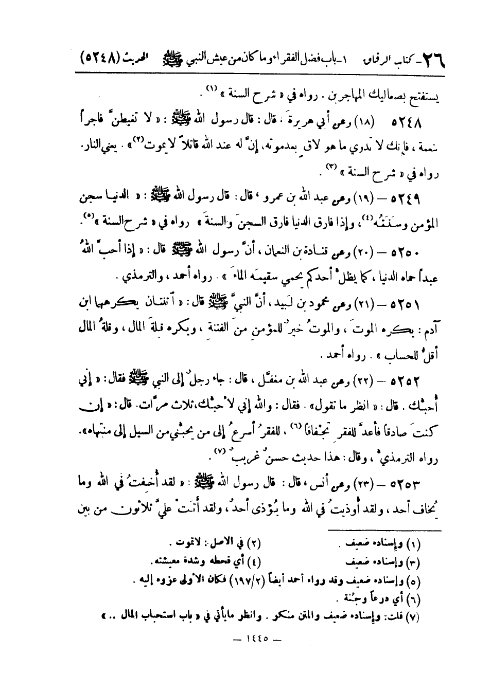 عَبْدِ اللَّهِ بْنِ عَمْرٍو قَالَ: قَالَ رَسُولُ اللَّهِ صَلَّى اللَّهُ عَلَيْهِ وَسَلَّمَ: «الدُّنْيَا سِجْنُ الْمُؤْمِنِ وَسَنَتُهُ وَإِذَا فَارَقَ الدُّنْيَا فَارَقَ السجنَ والسنةَ» . رَوَاهُ فِي «شرح السّنة»
