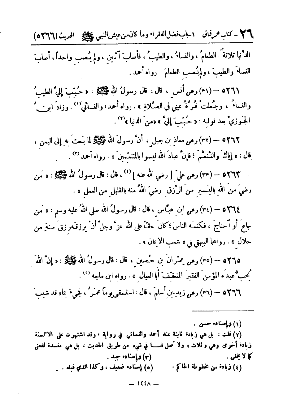أَنَسٍ قَالَ: قَالَ رَسُولُ اللَّهِ صَلَّى اللَّهُ عَلَيْهِ وَسَلَّمَ: «حُبِّبَ إِلَيَّ الطِّيبُ وَالنِّسَاءُ وَجُعِلَتْ قُرَّةُ عَيْنِي فِي الصَّلَاةِ» . رَوَاهُ أَحْمَدُ وَالنَّسَائِيُّ. وَزَادَ ابْنُ الْجَوْزِيِّ بَعْدَ قَوْلِهِ: «حُبِّبَ إِليَّ» منَ الدُّنْيَا "