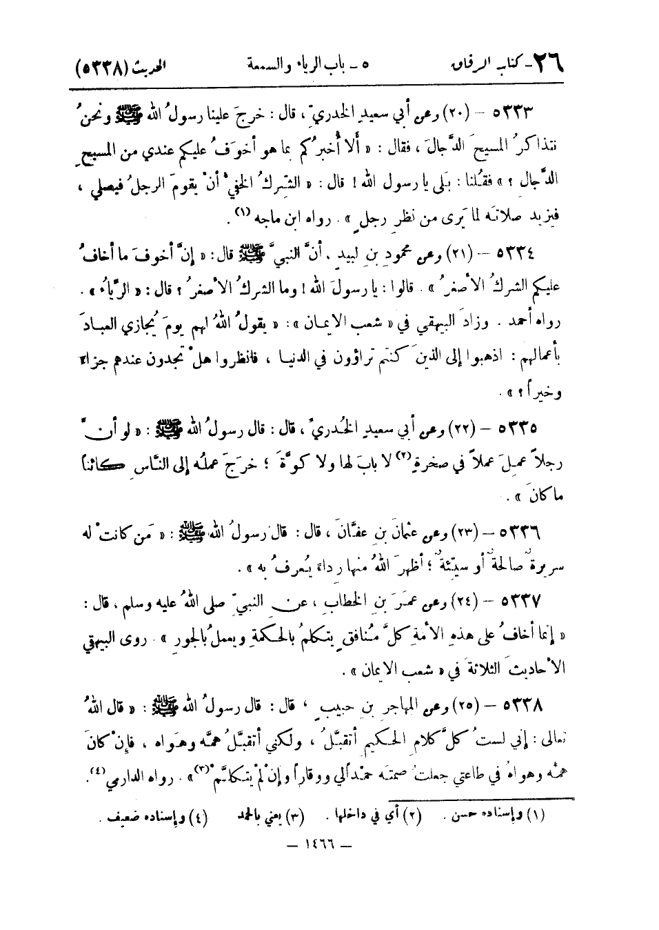 أبي سعيد الْخُدْرِيّ قَالَ: خَرَجَ عَلَيْنَا رَسُولُ اللَّهِ صَلَّى اللَّهُ عَلَيْهِ وَسَلَّمَ وَنَحْنُ نَتَذَاكَرُ الْمَسِيحَ الدَّجَّالَ فَقَالَ: «أَلَا أُخْبِرُكُمْ بِمَا هُوَ أَخْوَفُ عَلَيْكُمْ عِنْدِي مِنَ الْمَسِيحِ الدَّجَّالِ؟» فَقُلْنَا: بَلَى يَا رَسُولَ اللَّهِ قَالَ: «الشِّرْكُ الْخَفِيُّ أَنْ يَقُومَ الرَّجُلُ فَيُصَلِّيَ فَيَزِيدَ صَلَاتَهُ لِمَا يَرَى مِنْ نَظَرِ رجلٍ» . رَوَاهُ ابْن مَاجَه "
