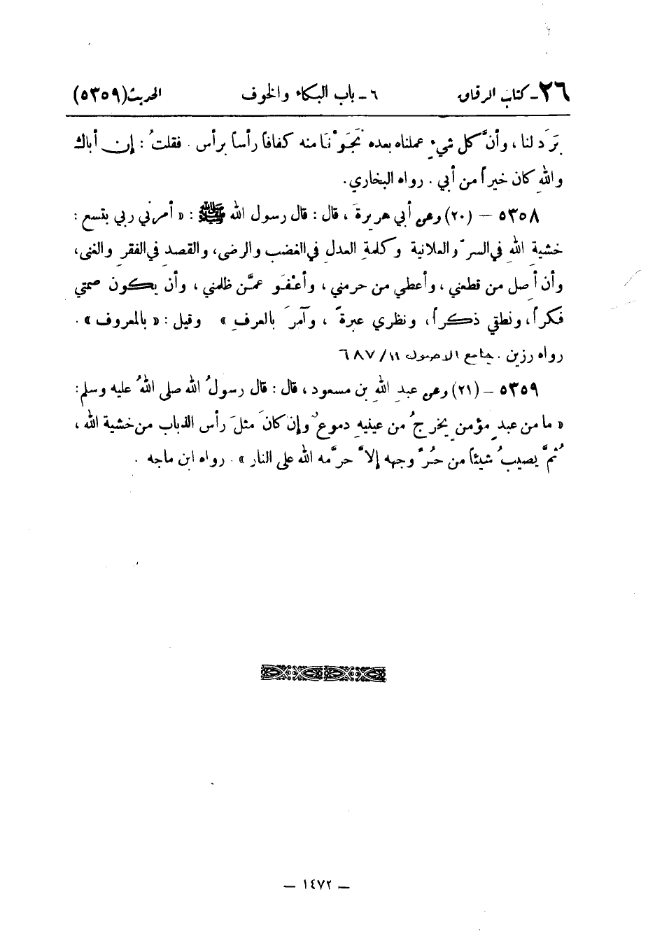 اللَّهِ بْنِ مَسْعُودٍ قَالَ: قَالَ رَسُولُ اللَّهِ صَلَّى اللَّهُ عَلَيْهِ وَسَلَّمَ: «مَا مِنْ عَبْدٍ مُؤْمِنٍ يَخْرُجُ مِنْ عَيْنَيْهِ دُمُوعٌ وَإِنْ كَانَ مِثْلَ رَأْسِ الذُّبَابِ مِنْ خَشْيَةِ اللَّهِ ثُمَّ يُصِيبُ شَيْئًا مِنْ حَرِّ وَجْهِهِ إِلَّا حَرَّمَهُ اللَّهُ عَلَى النَّارِ» . رَوَاهُ ابْنُ مَاجَه