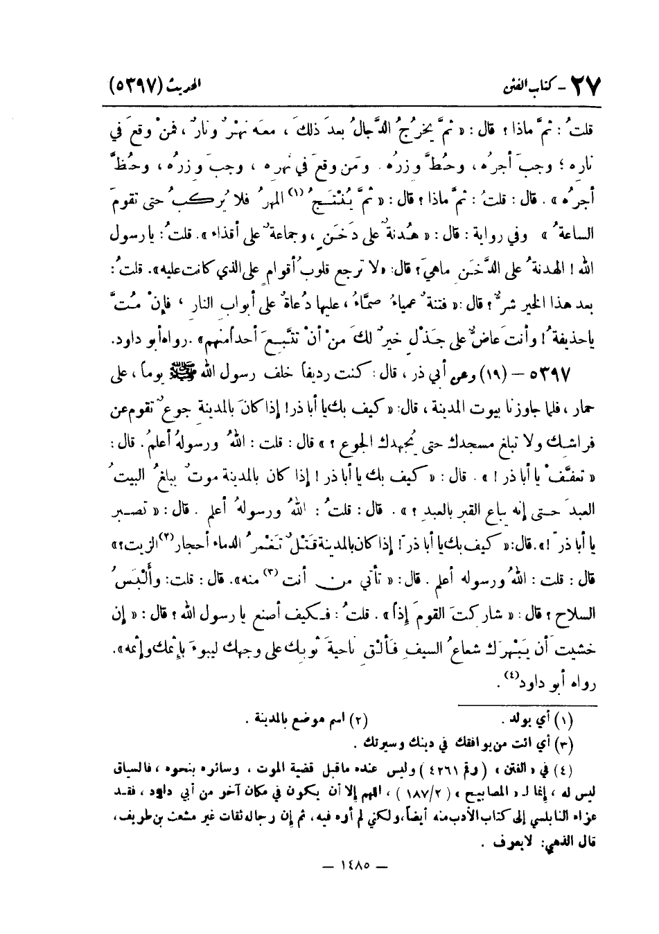ذَر قَالَ: كُنْتُ رَدِيفًا خَلْفَ رَسُولِ اللَّهِ صَلَّى اللَّهُ عَلَيْهِ وَسَلَّمَ يَوْمًا علىحمار فَلَمَّا جَاوَزْنَا بُيُوتَ الْمَدِينَةِ قَالَ: «كَيْفَ بِكَ يَا أَبَا ذَرٍّ إِذَا كَانَ بِالْمَدِينَةِ جُوعٌ تَقُومُ عَنْ فِرَاشِكَ وَلَا تَبْلُغُ مَسْجِدَكَ حَتَّى يُجْهِدَكَ الْجُوعُ؟» قَالَ: قُلْتُ: اللَّهُ وَرَسُولُهُ أَعْلَمُ. قَالَ: «تَعَفَّفْ يَا أَبَا ذَرٍّ» . قَالَ: «كَيْفَ بِكَ يَا أَبَا ذَرٍّ إِذَا كَانَ بِالْمَدِينَةِ مَوْتٌ يَبْلُغُ الْبَيْتَ الْعَبْدُ حَتَّى إِنَّهُ يُبَاعُ الْقَبْرُ بِالْعَبْدِ؟» . قَالَ: قُلْتُ اللَّهُ وَرَسُولُهُ أَعْلَمُ. قَالَ: «تَصْبِرُ يَا أَبَا ذَرٍّ» . قَالَ: «كَيْفَ بِكَ يَا أَبَا ذَرٍّ إِذَا كَانَ بِالْمَدِينَةِ قَتْلٌ تَغْمُرُ الدِّمَاءُ أَحْجَارَ الزَّيْتِ؟» قَالَ: قُلْتُ: اللَّهُ وَرَسُولُهُ أَعْلَمُ. قَالَ: «تَأْتِي مَنْ أَنْتَ مِنْهُ» . قَالَ: قُلْتُ: وَأَلْبَسُ السِّلَاحَ؟ قَالَ: «شَارَكْتَ الْقَوْمَ إِذًا» . قُلْتُ: فَكَيْفَ أَصْنَعُ يَا رَسُولَ اللَّهِ؟ قَالَ: «إِنْ خَشِيتَ أَنْ يَبْهَرَكَ شُعَاعُ السَّيْفِ فَأَلْقِ نَاحِيَةَ ثَوْبِكَ عَلَى وَجْهِكَ لِيَبُوءَ بإِثمك وإِثمه» . رَوَاهُ أَبُو دَاوُد