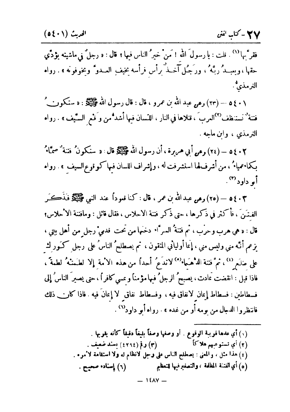 اللَّهِ بْنِ عَمْرٍو قَالَ: قَالَ رَسُولُ اللَّهِ صَلَّى اللَّهُ عَلَيْهِ وَسَلَّمَ: «سَتَكُونُ فِتْنَةٌ تَسْتَنْظِفُ الْعَرَبَ قَتْلَاهَا فِي النَّارِ اللِّسَانُ فِيهَا أَشَدُّ مِنْ وَقْعِ السَّيْفِ» . رَوَاهُ التِّرْمِذِيُّ وَابْن مَاجَه