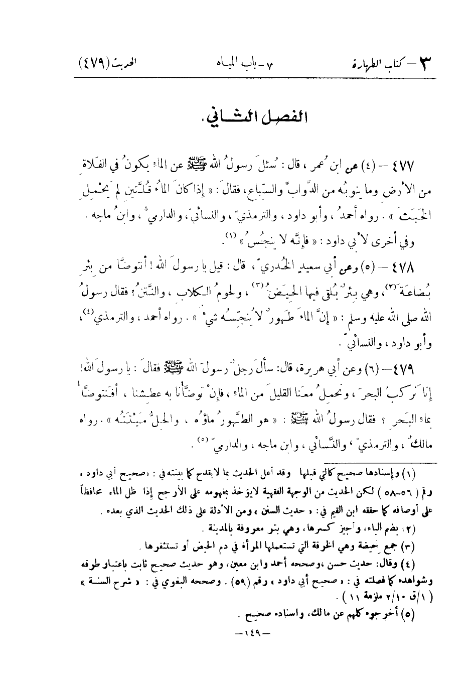 عَنِ ابْنِ عُمَرَ قَالَ سُئِلَ رَسُولُ اللَّهِ صَلَّى اللَّهُ عَلَيْهِ وَسَلَّمَ عَنِ الْمَاءِ يَكُونُ فِي الْفَلَاةِ مِنَ الْأَرْضِ وَمَا يَنُوبُهُ مِنَ الدَّوَابّ وَالسِّبَاع فَقَالَ رَسُولُ اللَّهِ صَلَّى اللَّهُ عَلَيْهِ وَسَلَّمَ: «إِذَا كَانَ الْمَاءُ قُلَّتَيْنِ لَمْ يَحْمِلِ الْخَبَثَ» . رَوَاهُ أَحْمد وَأَبُو دَاوُد وَالتِّرْمِذِيّ وَالنَّسَائِيّ والدارمي وَابْنُ مَاجَهْ وَفِي أُخْرَى لِأَبِي دَاوُدَ: «فَإِنَّهُ لَا ينجس»