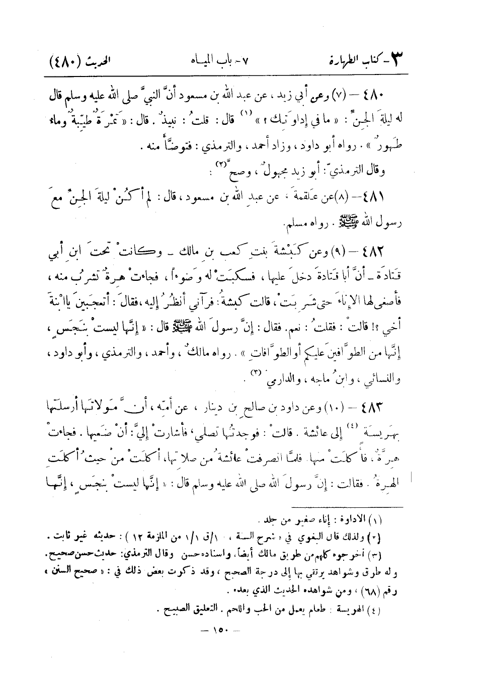 وَعَن كَبْشَة بنت كَعْب بن مَالك وَكَانَتْ تَحْتَ ابْنِ أَبِي قَتَادَةَ: أَنَّ أَبَا قَتَادَة دخل فَسَكَبَتْ لَهُ وَضُوءًا فَجَاءَتْ هِرَّةٌ تَشْرَبُ مِنْهُ فَأَصْغَى لَهَا الْإِنَاءَ حَتَّى شَرِبَتْ قَالَتْ كَبْشَةُ فَرَآنِي أَنْظُرُ إِلَيْهِ فَقَالَ أَتَعْجَبِينَ يَا ابْنَةَ أخي فَقُلْتُ نَعَمْ فَقَالَ إِنَّ رَسُولَ اللَّهِ صَلَّى اللَّهُ عَلَيْهِ وَسَلَّمَ قَالَ: «إِنَّهَا لَيست بِنَجس إِنَّهَا من الطوافين عَلَيْكُم والطوافات» . رَوَاهُ مَالِكٌ وَأَحْمَدُ وَالتِّرْمِذِيُّ