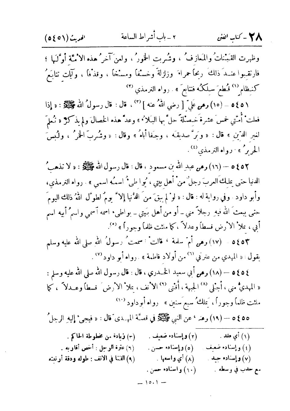 عَبْدِ اللَّهِ بْنِ مَسْعُودٍ قَالَ: قَالَ رَسُولُ اللَّهِ صَلَّى اللَّهُ عَلَيْهِ وَسَلَّمَ: «لَا تَذْهَبُ الدُّنْيَا حَتَّى يَمْلِكَ الْعَرَبَ رَجُلٌ مِنْ أهلِ بَيْتِي يُواطِىءُ اسمُه اسْمِي» رَوَاهُ التِّرْمِذِيُّ وَأَبُو دَاوُدَ. وَفِي رِوَايَةٍ لَهُ: «لَوْ لَمْ يَبْقَ مِنَ الدُّنْيَا إِلَّا يَوْمٌ لَطَوَّلَ اللَّهُ ذَلِكَ الْيَوْمَ حَتَّى يَبْعَثَ اللَّهُ فِيهِ رَجُلًا مِنِّي - أَوْ مِنْ أَهْلِ بَيْتِي - يُوَاطِئُ اسْمُهُ اسْمِيَ وَاسْمُ أَبِيهِ اسْمَ أَبِي يَمْلَأُ الْأَرْضَ قِسْطًا وَعَدْلًا كَمَا مُلِئَتْ ظُلْمًا وجورا»