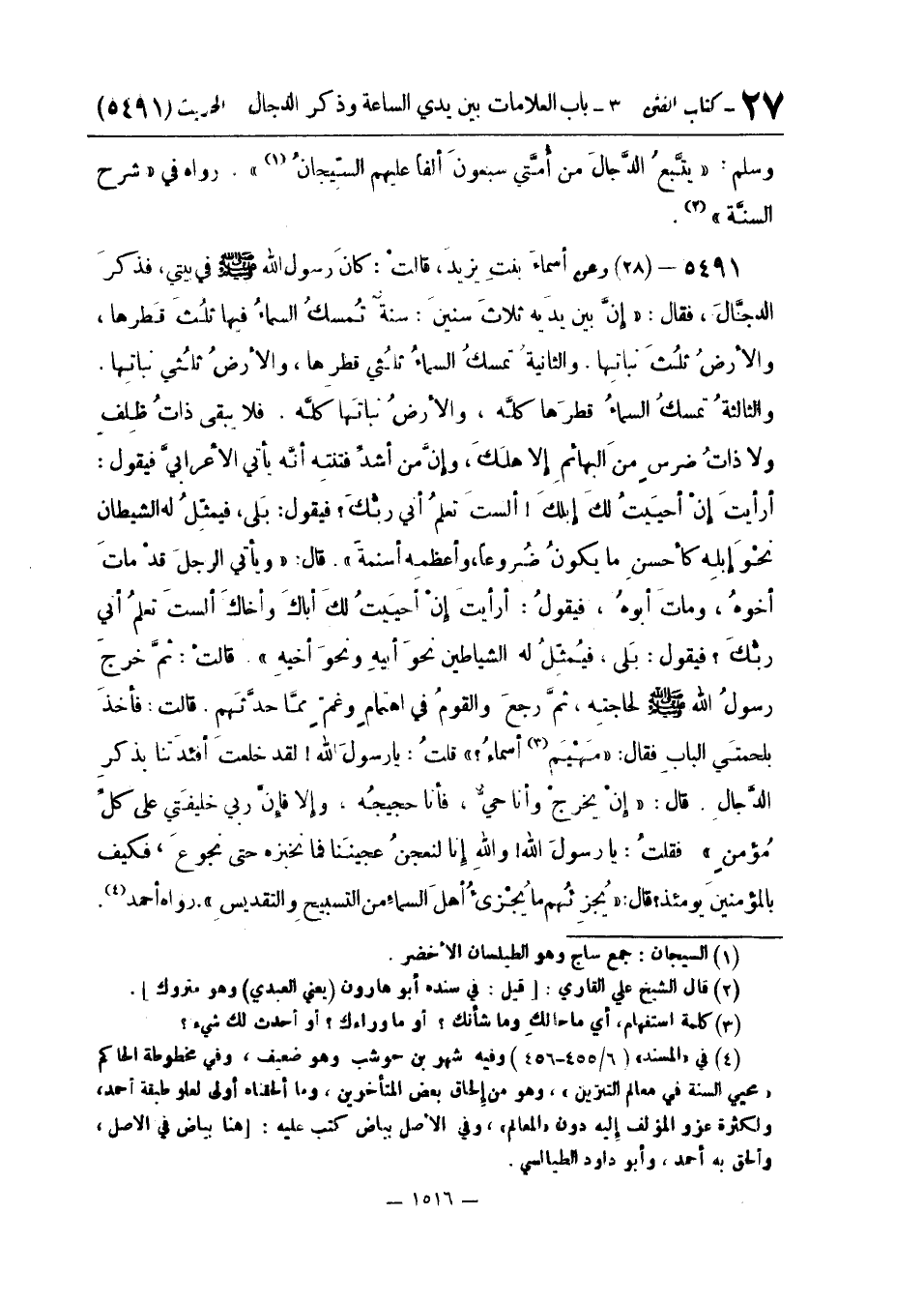 أسماءَ بنتِ يزيدَ قَالَتْ: كَانَ رَسُولُ اللَّهِ صَلَّى اللَّهُ عَلَيْهِ وَسَلَّمَ فِي بَيْتِي فَذَكَرَ الدَّجَّالَ فَقَالَ: " إِنَّ بَيْنَ يَدَيْهِ ثَلَاث سِنِين سنة تمسلك السَّمَاءُ فِيهَا ثُلُثَ قَطْرِهَا وَالْأَرْضُ ثُلُثَ نَبَاتِهَا. وَالثَّانِيَةُ تُمْسِكُ السَّمَاءُ ثُلُثَيْ قَطْرِهَا وَالْأَرْضُ ثُلُثَيْ نَبَاتِهَا. وَالثَّالِثَةُ تُمْسِكُ السَّمَاءُ قَطْرَهَا كُلَّهُ وَالْأَرْضُ نَبَاتَهَا كُلَّهُ. فَلَا يَبْقَى ذَاتُ ظِلْفٍ وَلَا ذَاتُ ضِرْسٍ مِنَ الْبَهَائِمِ إِلَّا هَلَكَ وَإِنَّ مِنْ أَشَدِّ فِتْنَتِهِ أَنَّهُ يَأْتِي الْأَعْرَابِيَّ فَيَقُولُ: أَرَأَيْتَ إِنْ أَحْيَيْتُ لَكَ إِبِلَكَ أَلَسْتَ تَعْلَمُ أَنِّي رَبُّكَ؟ فَيَقُولُ بَلَى فَيُمَثِّلُ لَهُ الشَّيْطَانَ نَحْوَ إِبِلِهِ كَأَحْسَنِ مَا يَكُونُ ضُرُوعًا وَأَعْظَمِهِ أَسْنِمَةً ". قَالَ: " وَيَأْتِي الرَّجُلَ قَدْ مَاتَ أَخُوهُ وَمَاتَ أَبُوهُ فَيَقُولُ: أَرَأَيْتَ إِنْ أَحْيَيْتُ لَكَ أَبَاكَ وَأَخَاكَ أَلَسْتَ تَعْلَمُ أَنِّي رَبُّكَ؟ فَيَقُولُ: بَلَى فَيُمَثِّلُ لَهُ الشَّيَاطِينَ نَحْوَ أَبِيهِ وَنَحْوَ أَخِيهِ ". قَالَتْ: ثُمَّ خَرَجَ رَسُولُ اللَّهِ صَلَّى اللَّهُ عَلَيْهِ وَسَلَّمَ لِحَاجَتِهِ ثُمَّ رَجَعَ وَالْقَوْمُ فِي اهْتِمَامٍ وَغَمٍّ مِمَّا حَدَّثَهُمْ. قَالَتْ: فَأَخَذَ بِلَحْمَتَيِ الْبَابِ فَقَالَ: «مَهْيَمْ أَسْمَاءُ؟» قُلْتُ: يَا رَسُولَ اللَّهِ لَقَدْ خَلَعْتَ أَفْئِدَتَنَا بِذِكْرِ الدَّجَّالِ. قَالَ: «إِنْ يَخْرُجْ وَأَنَا حَيٌّ فَأَنَا حَجِيجُهُ وَإِلَّا فإِنَّ رَبِّي خليفتي علىكل مُؤْمِنٍ» فَقُلْتُ: يَا رَسُولَ اللَّهِ وَاللَّهِ إِنَّا لَنَعْجِنُ عَجِينَنَا فَمَا نَخْبِزُهُ حَتَّى نَجُوعَ فَكَيْفَ بِالْمُؤْمِنِينَ يَوْمَئِذٍ؟ قَالَ: «يُجْزِئُهُمْ مَا يُجْزِئُ أَهْلَ السماءِ من التسبيحِ والتقديسِ» . رَوَاهُ أَحْمد