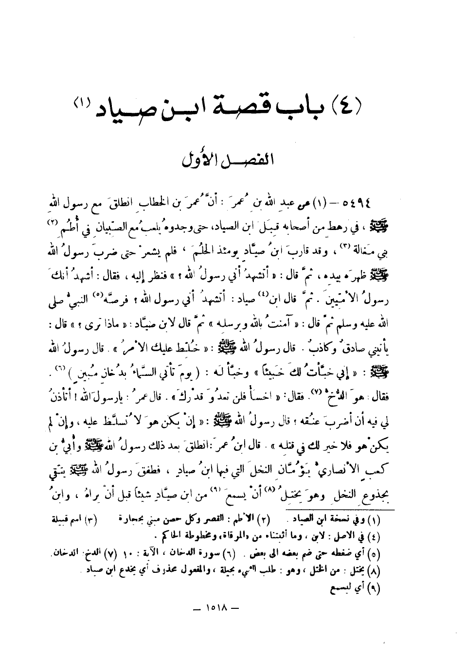 عَنْ عَبْدِ اللَّهِ بْنِ عُمَرَ أَنَّ عُمَرَ بن الْخطاب انْطَلَقَ مَعَ رَسُولِ اللَّهِ صَلَّى اللَّهُ عَلَيْهِ وَسَلَّمَ فِي رَهْطٍ مِنْ أَصْحَابِهِ قِبَلَ ابْنِ الصياد حَتَّى وجدوهُ يلعبُ مَعَ الصّبيانِ فِي أُطُمِ بَنِي مَغَالَةَ وَقَدْ قَارَبَ ابْنُ صَيَّادٍ يَوْمَئِذٍ الْحُلُمَ فَلَمْ يَشْعُرْ حَتَّى ضَرَبَ رَسُولُ اللَّهِ صَلَّى اللَّهُ عَلَيْهِ وَسَلَّمَ ظَهْرَهُ بِيَدِهِ ثمَّ قَالَ: «أتشهدُ أَنِّي رسولُ الله؟» فَقَالَ: أَشْهَدُ أَنَّكَ رَسُولُ الْأُمِّيِّينَ. ثُمَّ قَالَ ابْنُ صَيَّادٍ: أَتَشْهَدُ أَنِّي رَسُولُ اللَّهِ؟ فَرَصَّهُ النَّبِيِّ صَلَّى اللَّهُ عَلَيْهِ وَسَلَّمَ ثُمَّ قَالَ: «آمَنت بِاللَّه وبرسلِه» ثمَّ قَالَ لِابْنِ صيَّاد: «مَاذَا تَرَى؟» قَالَ: يَأْتِينِي صَادِقٌ وَكَاذِبٌ. قَالَ رَسُولُ اللَّهِ صَلَّى اللَّهُ عَلَيْهِ وَسَلَّمَ: «خُلِّطَ عَلَيْكَ الْأَمْرُ» . قَالَ رَسُولُ اللَّهِ صَلَّى اللَّهُ عَلَيْهِ وَسَلَّمَ: «إِنِّي خَبَّأْتُ لَكَ خَبِيئًا» وَخَبَّأَ لَه: (يومَ تَأتي السَّماءُ بدُخانٍ مُبينٍ)