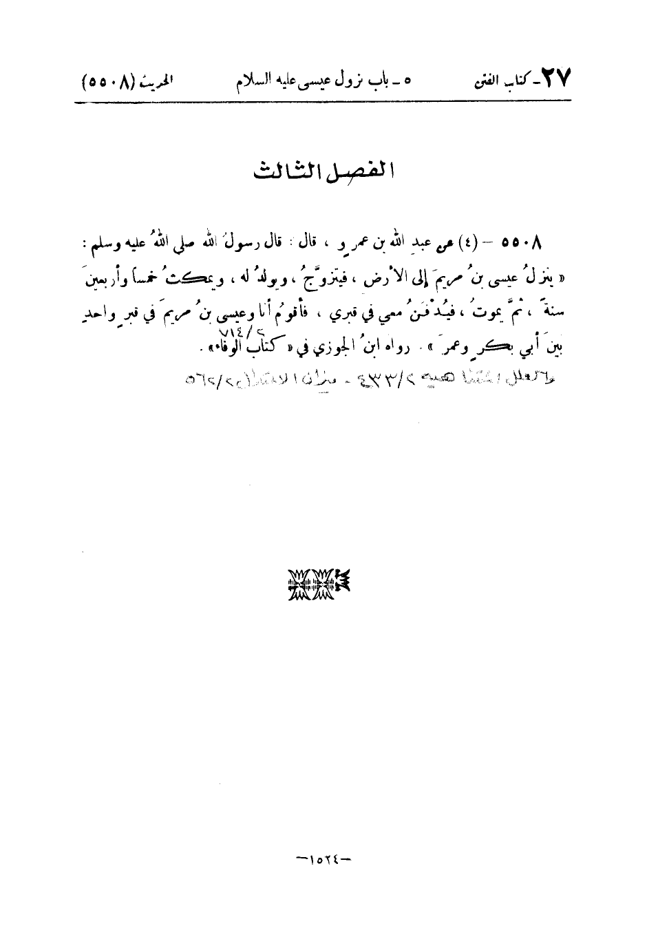 5508 -[4] عَن عبد الله بن عَمْرو قا ل: قا ل رَسُولُ اللَّهِ صَلَّى اللَّهُ عَلَيْهِ وَسَلَّمَ: «يَنْزِلُ عِيسَى بن مَرْيَمَ إِلَى الْأَرْضِ فَيَتَزَوَّجُ وَيُولَدُ لَهُ وَيَمْكُثُ خَمْسًا وَأَرْبَعِينَ سَنَةً ثُمَّ يَمُوتُ فَيُدْفَنُ مَعِي فِي قَبْرِي فأقوم أَنا وَعِيسَى بن مَرْيَمَ فِي قَبْرٍ وَاحِدٍ بَيْنَ أَبَى بَكْرٍ وَعُمَرَ» . رَوَاهُ ابْنُ الْجَوْزِيِّ فِي كِتَابِ الْوَفَاءِ