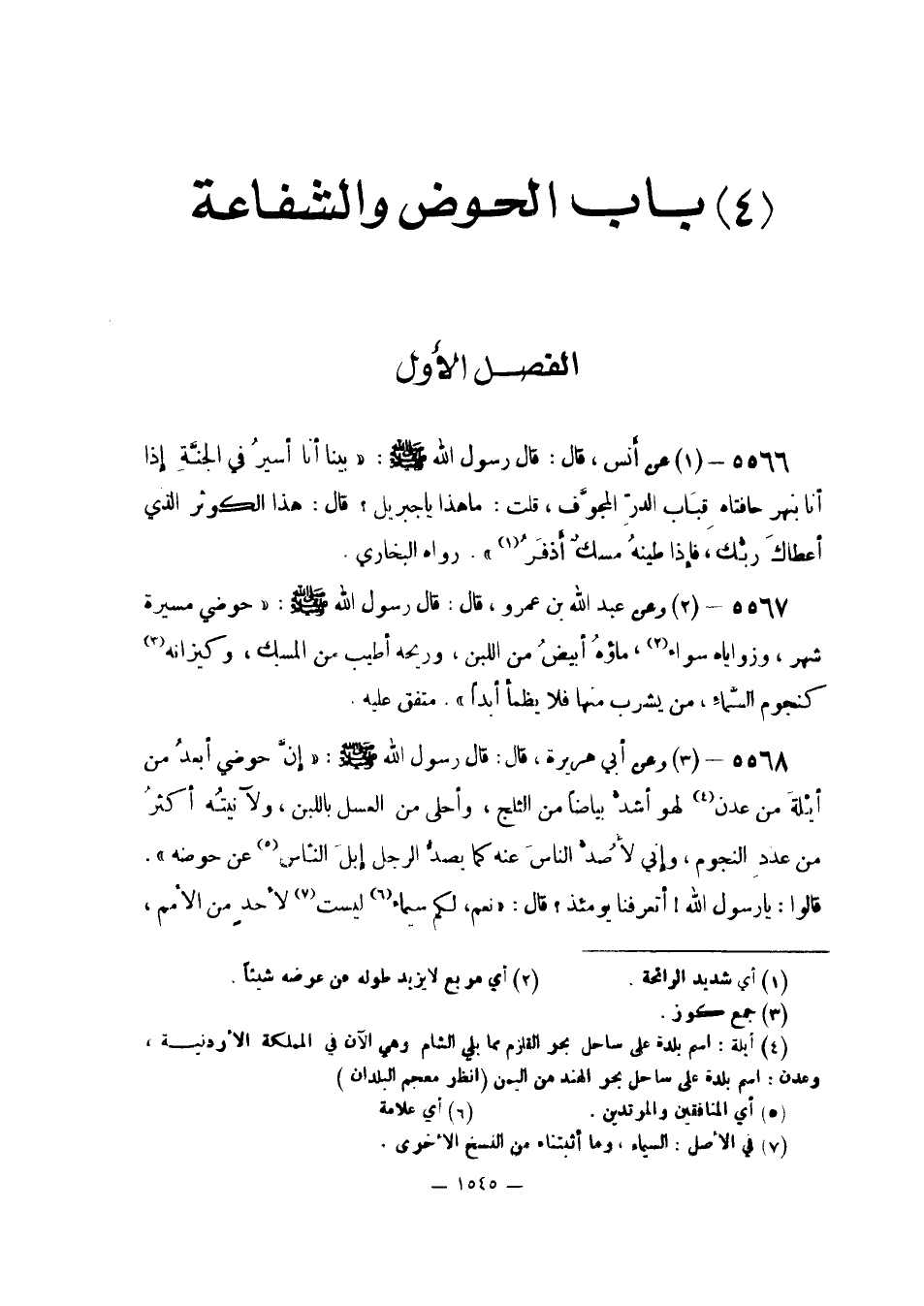وَعَنْ عَبْدِ اللَّهِ بْنِ عَمْرٍو قَالَ: قَالَ رَسُولُ اللَّهِ صَلَّى اللَّهُ عَلَيْهِ وَسَلَّمَ: «حَوْضِي مَسِيرَةُ شَهْرٍ وَزَوَايَاهُ سَوَاءٌ مَاؤُهُ أَبْيَضُ مِنَ اللَّبَنِ وَرِيحُهُ أَطْيَبُ مِنَ الْمِسْكِ وَكِيزَانُهُ كَنُجُومِ السَّمَاءِ مَنْ يَشْرَبُ مِنْهَا فَلَا يظمأ أبدا» . مُتَّفق عَلَيْهِ