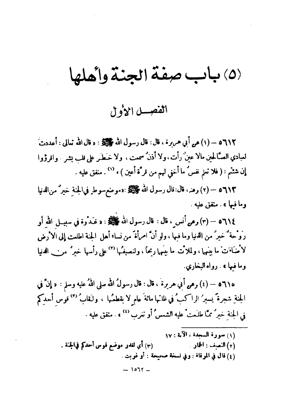 عَنْ أَبِي هُرَيْرَةَ قَالَ: قَالَ رَسُولُ اللَّهِ صَلَّى اللَّهُ عَلَيْهِ وَسَلَّمَ: " قَالَ اللَّهُ تَعَالَى: أَعْدَدْتُ لِعِبَادِيَ الصَّالِحِينَ مَا لَا عَيْنٌ رَأَتْ وَلَا أُذُنٌ سَمِعَتْ وَلَا خَطَرَ عَلَى قَلْبِ بشر. واقرؤوا إِنْ شِئْتُمْ: (فَلَا تَعْلَمُ نَفْسٌ مَا أُخْفِيَ لَهُمْ مِنْ قُرَّة عين)