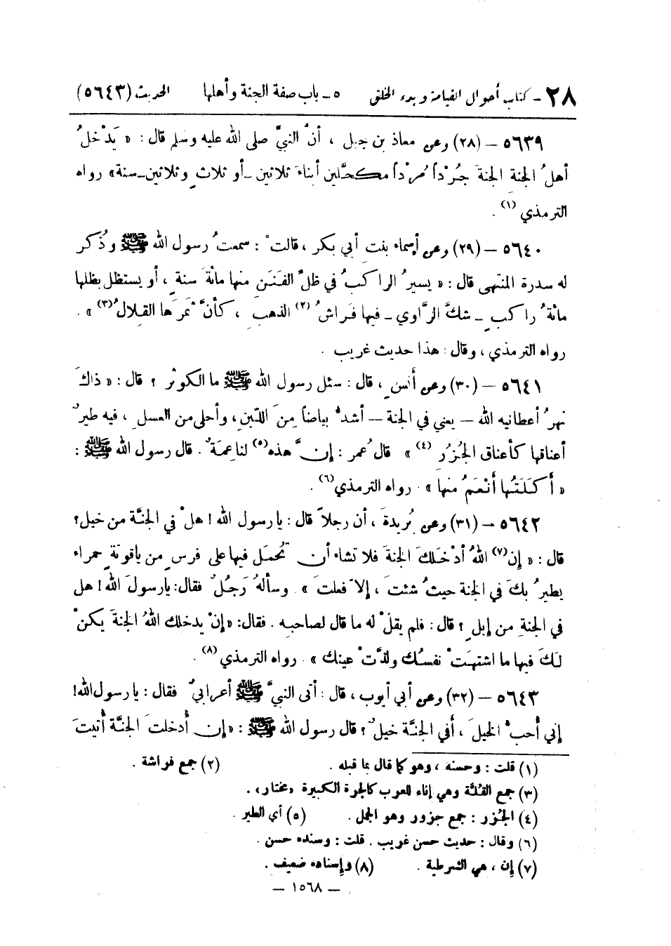 أَنَسٍ قَالَ سُئِلَ رَسُولُ اللَّهِ صَلَّى اللَّهُ عَلَيْهِ وَسَلَّمَ ماالكوثر؟ قَالَ: «ذَاكَ نَهْرٌ أَعْطَانِيهِ اللَّهُ يَعْنِي فِي الْجَنَّةِ أَشَدُّ بَيَاضًا مِنَ اللَّبَنِ وَأَحْلَى مِنَ الْعَسَلِ فِيهِ طَيْرٌ أَعْنَاقُهَا كَأَعْنَاقِ الْجُزُرِ» قَالَ عُمَرُ: إِنَّ هَذِهِ لَنَاعِمَةٌ قَالَ رَسُولُ اللَّهِ صَلَّى اللَّهُ عَلَيْهِ وَسَلَّمَ «أَكَلَتُهَا أَنْعَمُ مِنْهَا» رَوَاهُ التِّرْمِذِيّ