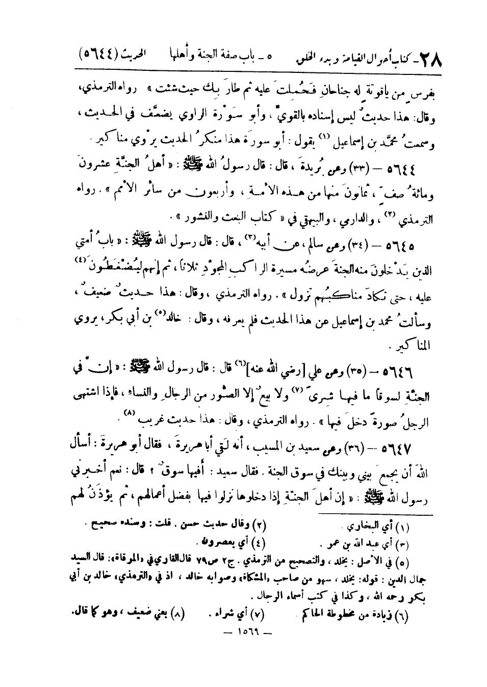 سعيد بن الْمسيب أَنه لقيَ أَبَا هريرةَ فَقَالَ أَبُو هُرَيْرَةَ: أَسْأَلُ اللَّهَ أَنْ يَجْمَعَ بَيْنِي وَبَيْنَكَ فِي سُوقِ الْجَنَّةِ. فَقَالَ سَعِيدٌ: أَفِيهَا سُوقٌ؟ قَالَ: نَعَمْ أَخْبَرَنِي رَسُولُ اللَّهِ صَلَّى اللَّهُ عَلَيْهِ وَسَلَّمَ: «إِنَّ أَهْلَ الْجَنَّةِ إِذَا دَخَلُوهَا نَزَلُوا فِيهَا بِفَضْلِ أَعْمَالِهِمْ ثُمَّ يُؤْذَنُ لَهُمْ -[1570]- فِي مِقْدَارِ يَوْمِ الْجُمُعَةِ مِنْ أَيَّامِ الدُّنْيَا فَيَزُورُونَ رَبَّهُمْ وَيَبْرُزُ لَهُمْ عَرْشُهُ وَيَتَبَدَّى لَهُم فِي روضةٍ من رياضِ الجنَّة فَيُوضَع لَهُم مَنَابِر من نور ومنابرمن لُؤْلُؤٍ وَمَنَابِرُ مِنْ يَاقُوتٍ وَمَنَابِرُ مِنْ زَبَرْجَدٍ وَمَنَابِرُ مِنْ ذَهَبٍ وَمَنَابِرُ مِنْ فِضَّةٍ وَيَجْلِسُ أَدْنَاهُم - وَمَا فيهم دنيٌّ - عَلَى كُثْبَانِ الْمِسْكِ وَالْكَافُورِ مَا يَرَوْنَ أَنَّ أَصْحَابَ الْكَرَاسِيِّ بِأَفْضَلَ مِنْهُمْ مَجْلِسًا» . قَالَ أَبُو هُرَيْرَةَ: قُلْتُ: يَا رَسُولَ اللَّهِ وَهَلْ نَرَى رَبَّنَا؟ قَالَ: «نَعَمْ هَلْ تَتَمَارَوْنَ فِي رُؤْيَةِ الشَّمْسِ وَالْقَمَرِ لَيْلَةَ الْبَدْرِ؟» قُلْنَا: لَا. قَالَ: " كَذَلِكَ لَا تَتَمَارَوْنَ فِي رُؤْيَةِ رَبِّكُمْ وَلَا يَبْقَى فِي ذَلِكَ الْمَجْلِسِ رَجُلٌ إِلَّا حَاضَرَهُ اللَّهُ مُحَاضَرَةً حَتَّى يَقُولَ لِلرَّجُلِ مِنْهُمْ: يَا فلَان ابْن فلَان أَتَذكر يَوْم قلت كَذَا وَكَذَا؟ فيذكِّره بِبَعْض غدارته فِي الدُّنْيَا. فَيَقُولُ: يَا رَبِّ أَفَلَمْ تَغْفِرْ لِي؟ فَيَقُولُ: بَلَى فَبِسِعَةِ مَغْفِرَتِي بَلَغْتَ مَنْزِلَتَكَ هَذِهِ. فَبَيْنَا هُمْ عَلَى ذَلِكَ غَشِيتْهُمْ سَحَابَةٌ مِنْ فَوْقِهِمْ فَأَمْطَرَتْ عَلَيْهِمْ طِيبًا لَمْ يَجِدُوا مِثْلَ رِيحِهِ شَيْئًا قَطُّ وَيَقُولُ رَبُّنَا: قُومُوا إِلَى مَا أَعْدَدْتُ لَكُمْ مِنَ الْكَرَامَةِ فَخُذُوا مَا اشْتَهَيْتُمْ فَنَأْتِي سُوقًا قَدْ حَفَّتْ بِهِ الْمَلَائِكَةُ فِيهَا مَا لَمْ تَنْظُرِ الْعُيُونُ إِلَى مِثْلِهِ وَلَمْ تَسْمَعِ الْآذَانُ وَلَمْ يَخْطُرْ عَلَى الْقُلُوبِ فَيُحْمَلُ لَنَا مَا اشْتَهَيْنَا لَيْسَ يُبَاعُ فِيهَا وَلَا يُشْتَرَى وَفِي ذَلِكَ السُّوقِ يَلْقَى أَهْلُ الْجَنَّةِ بَعْضُهُمْ بَعْضًا ". قَالَ: " فَيُقْبِلُ الرَّجُلُ ذُو الْمَنْزِلَةِ الْمُرْتَفِعَةِ فَيَلْقَى مَنْ هُوَ دُونَهُ - وَمَا فيهم دنيٌّ - فيروعُه مَا يرى عَلَيْهِ من اللباسِ فِيمَا يَنْقَضِي آخِرُ حَدِيثِهِ حَتَّى يَتَخَيَّلَ عَلَيْهِ مَا هُوَ أحسن مِنْهُ وَذَلِكَ أَنَّهُ لَا يَنْبَغِي لِأَحَدٍ أَنْ يَحْزَنَ فِيهَا ثُمَّ نَنْصَرِفُ إِلَى مَنَازِلِنَا فَيَتَلَقَّانَا أَزْوَاجُنَا فَيَقُلْنَ: مَرْحَبًا وَأَهْلًا لَقَدْ جِئْتَ وَإِنَّ بِكَ مِنَ الْجَمَالِ أَفْضَلَ مِمَّا فَارَقْتَنَا عَلَيْهِ فَيَقُولُ: إِنَّا جَالَسْنَا الْيَوْمَ رَبَّنَا الْجَبَّارَ وَيَحِقُّنَا أَنْ نَنْقَلِبَ بِمِثْلِ مَا انْقَلَبْنَا ". رَوَاهُ التِّرْمِذِيُّ وَابْنُ مَاجَهْ وَقَالَ التِّرْمِذِيُّ: هَذَا حَدِيث غَرِيب