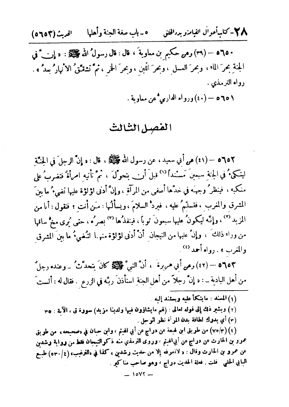 أَبِي سَعِيدٍ عَنْ رَسُولِ اللَّهِ صَلَّى اللَّهُ عَلَيْهِ وَسَلَّمَ قَالَ: " إِنَّ الرَّجُلَ فِي الْجَنَّةِ لَيَتَّكِئُ فِي الْجَنَّةِ سَبْعِينَ مَسْنَدًا قَبْلَ أَنْ يَتَحَوَّلَ ثُمَّ تَأْتِيهِ امْرَأَةٌ فَتَضْرِبُ عَلَى مَنْكِبِهِ فَيَنْظُرُ وَجْهَهُ فِي خَدِّهَا أَصْفَى مِنَ الْمِرْآةِ وَإِنَّ أَدْنَى لُؤْلُؤَةٍ عَلَيْهَا تُضِيءُ مَا بينَ المشرقِ والمغربِ فتسلِّمُ عَلَيْهِ فيردُّ السلامَ وَيَسْأَلُهَا: مَنْ أَنْتِ؟ فَتَقُولُ: أَنَا مِنَ الْمَزِيدِ وَإِنَّهُ لَيَكُونُ عَلَيْهَا سَبْعُونَ ثَوْبًا فَيَنْفُذُهَا بَصَرُهُ حَتَّى يَرَى مُخَّ سَاقِهَا مِنْ وَرَاءِ ذَلِكَ وإِنَّ عَلَيْهَا من التيجان أَن أدنىلؤلؤة مِنْهَا لَتُضِيءُ مَا بَيْنَ الْمَشْرِقِ وَالْمَغْرِبِ ". رَوَاهُ أَحْمد