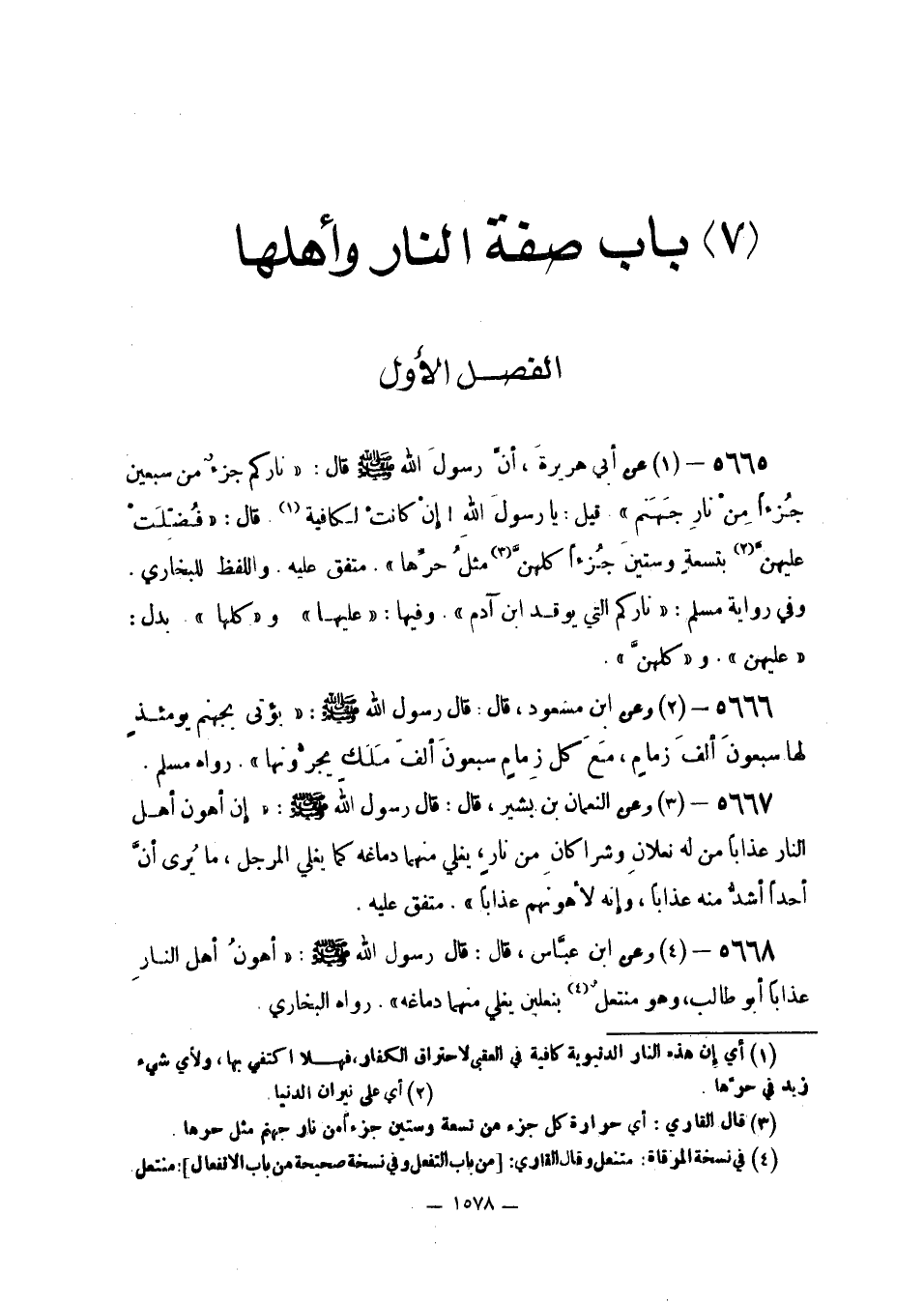 عَنْ أَبِي هُرَيْرَةَ أَنَّ رَسُولَ اللَّهِ صَلَّى اللَّهُ عَلَيْهِ وَسَلَّمَ قَالَ: «نَارُكُمْ جُزْءٌ مِنْ سَبْعِينَ جُزْءًا مِنْ نَارِ جَهَنَّمَ» قِيلَ: يَا رَسُولَ اللَّهِ إِنْ كَانَتْ لَكَافِيَةً قَالَ: «فُضِّلَتْ عَلَيْهِنَّ بِتِسْعَةٍ وَسِتِّينَ جُزْءًا كُلُّهُنَّ مِثْلُ حَرِّهَا» . مُتَّفَقٌ عَلَيْهِ. وَاللَّفْظُ لِلْبُخَارِيِّ. وَفِي رِوَايَةِ مُسْلِمٍ: «نَارُكُمُ الَّتِي يُوقِدُ ابْنُ آدَمَ» . وَفِيهَا: «عَلَيْهَا» و «كلهَا» بدل «عَلَيْهِنَّ» و «كُلهنَّ»