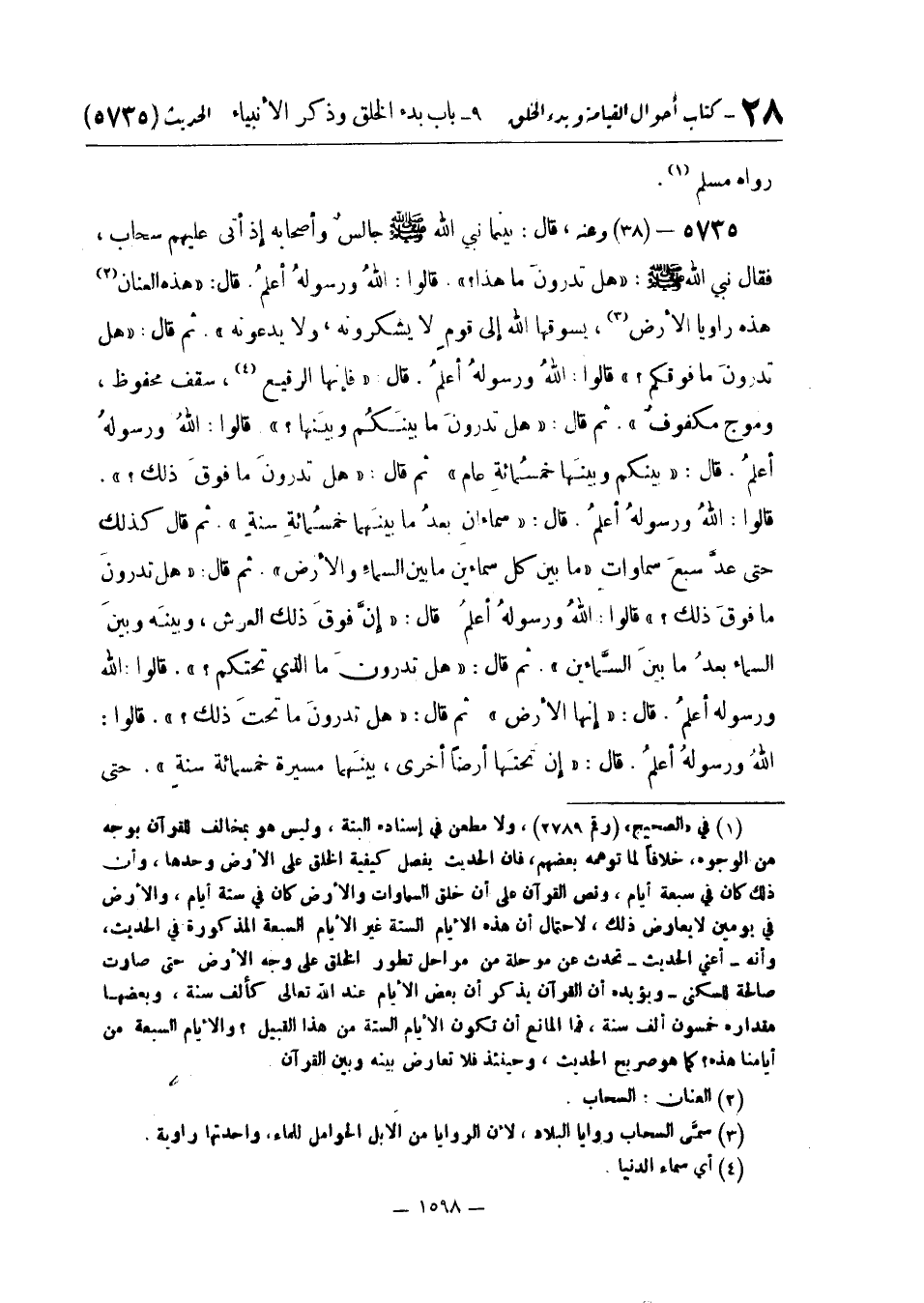 قَالَ: بَيْنَمَا نَبِيُّ اللَّهِ صَلَّى اللَّهُ عَلَيْهِ وَسَلَّمَ جَالِسٌ وَأَصْحَابُهُ إِذْ أَتَى عَلَيْهِمْ سَحَابٌ فَقَالَ نَبِيُّ اللَّهِ صَلَّى اللَّهُ عَلَيْهِ وَسَلَّمَ: «هَلْ تَدْرُونَ مَا هَذَا؟» . قَالُوا: اللَّهُ وَرَسُولُهُ أَعْلَمُ. قَالَ: «هَذِهِ الْعَنَانُ هَذِهِ رَوَايَا الْأَرْضِ يَسُوقُهَا اللَّهُ إِلَى قَوْمٍ لَا يَشْكُرُونَهُ وَلَا يَدعُونَهُ» . ثمَّ قَالَ: «هَل تَدْرُونَ من فَوْقَكُمْ؟» قَالُوا: اللَّهُ وَرَسُولُهُ أَعْلَمُ. قَالَ: «فَإِنَّهَا الرَّقِيعُ سَقْفٌ مَحْفُوظٌ وَمَوْجٌ مَكْفُوفٌ» . ثُمَّ قَالَ: «هَلْ تَدْرُونَ مَا بَيْنَكُمْ وَبَيْنَهَا؟» قَالُوا: اللَّهُ وَرَسُولُهُ أَعْلَمُ. قَالَ: «بَيْنَكُمْ وَبَيْنَهَا خَمْسُمِائَةِ عَامٍ» ثُمَّ قَالَ: «هَلْ تَدْرُونَ مَا فَوْقَ ذَلِكَ؟» . قَالُوا: اللَّهُ ورسولُه أعلمُ. قَالَ: «سماءانِ بُعْدُ مَا بَيْنَهُمَا خَمْسُمِائَةِ سَنَةٍ» . ثُمَّ قَالَ كَذَلِكَ حَتَّى عَدَّ سَبْعَ سَمَاوَاتٍ «مَا بَيْنَ كُلِّ سَمَاءَيْنِ مَا بَيْنَ السَّمَاءِ وَالْأَرْضِ» . ثُمَّ قَالَ: «هَلْ تَدْرُونَ مَا فَوْقَ ذَلِكَ؟» قَالُوا: اللَّهُ وَرَسُولُهُ أَعْلَمُ. قَالَ: «إِنَّ فَوْقَ ذَلِكَ الْعَرْشُ وَبَيْنَهُ وَبَيْنَ السَّمَاءِ بُعْدُ مَا بَيْنَ السَّماءين» . ثُمَّ قَالَ: «هَلْ تَدْرُونَ مَا تَحْتَ ذَلِكَ؟» . قَالُوا: اللَّهُ وَرَسُولُهُ أَعْلَمُ. قَالَ: «إِنَّ تَحْتَهَا أَرْضًا أُخْرَى بَيْنَهُمَا مَسِيرَةُ خَمْسِمِائَةِ سَنَةٍ» . حَتَّى -[1599]- عدَّ سَبْعَ أَرضين بَين كلَّ أَرضين مسيرَة خَمْسمِائَة سنة " قَالَ: «وَالَّذِي نَفْسُ مُحَمَّدٍ بِيَدِهِ لَوْ أَنَّكُمْ دَلَّيْتُمْ بِحَبْلٍ إِلَى الْأَرْضِ السُّفْلَى لَهَبَطَ عَلَى اللَّهِ» ثُمَّ قَرَأَ (هُوَ الْأَوَّلُ وَالْآخِرُ وَالظَّاهِرُ وَالْبَاطِنُ وَهُوَ بِكُلِّ شيءٍ عليم)
