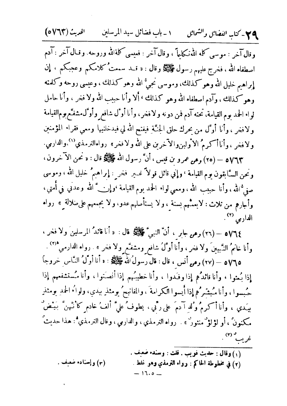 أَنَّ النَّبِيَّ صَلَّى اللَّهُ عَلَيْهِ وَسَلَّمَ قَالَ: «أَنَا قَائِدُ الْمُرْسَلِينَ وَلَا فَخْرَ وَأَنَا خَاتَمُ النَّبِيِّينَ وَلَا فَخْرَ وَأَنَا أَوَّلُ شافعٍ وَمُشَفَّع وَلَا فَخر» . رَوَاهُ الدَّارمِيّ