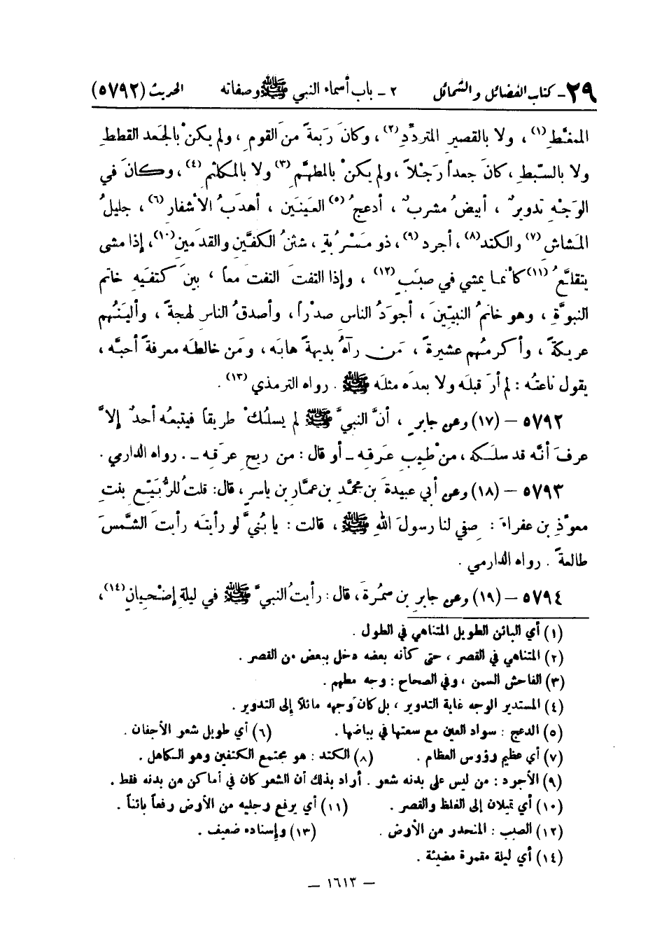 عُبَيْدَةَ بْنِ مُحَمَّدِ بْنِ عَمَّارِ بْنِ يَاسِرٍ قَالَ: قُلْتُ لِلرُّبَيِّعِ بِنْتِ مُعَوِّذِ بْنِ عَفْرَاءَ: صِفِي لَنَا رَسُولُ اللَّهِ صَلَّى اللَّهُ عَلَيْهِ وَسَلَّمَ قَالَتْ: يَا بُنَيَّ لَوْ رأيتَه رأيتَ الشَّمسَ طالعة. رَوَاهُ الدَّارمِيّ