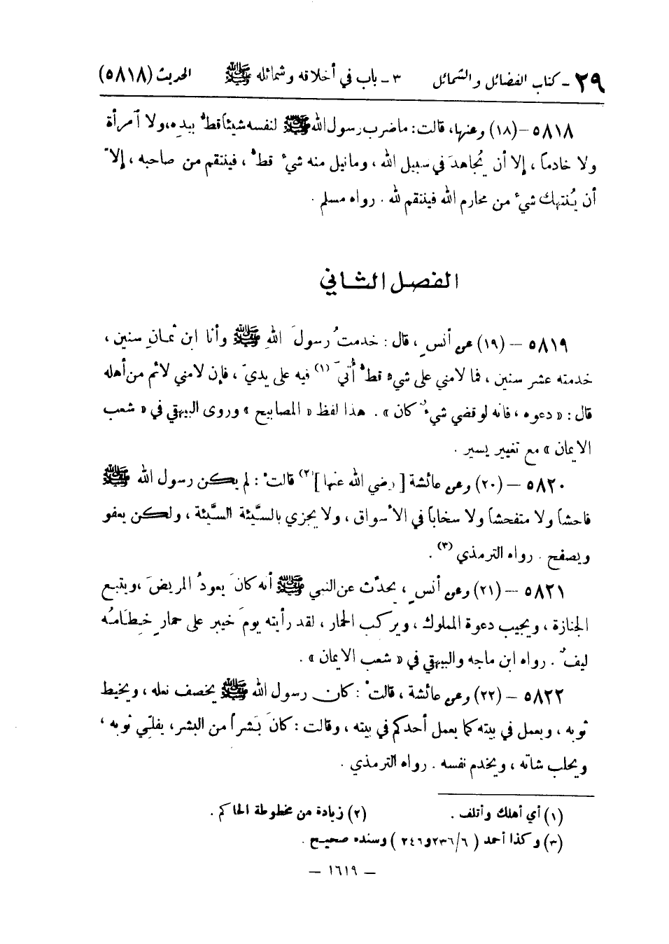 قَالَتْ: مَا ضَرَبَ رَسُولُ اللَّهِ صَلَّى اللَّهُ عَلَيْهِ وَسَلَّمَ لنَفسِهِ شَيْئًا قَطُّ بِيَدِهِ وَلَا امْرَأَةً وَلَا خَادِمًا إِلَّا أَنْ يُجَاهِدَ فِي سَبِيلِ اللَّهِ وَمَا نِيلَ مِنْهُ شَيْءٌ قَطُّ فَيَنْتَقِمُ مِنْ صَاحِبِهِ إِلَّا أَنْ يُنْتَهَكَ شَيْءٌ مِنْ مَحَارِمِ اللَّهِ فينتقم لله. رَوَاهُ مُسلم