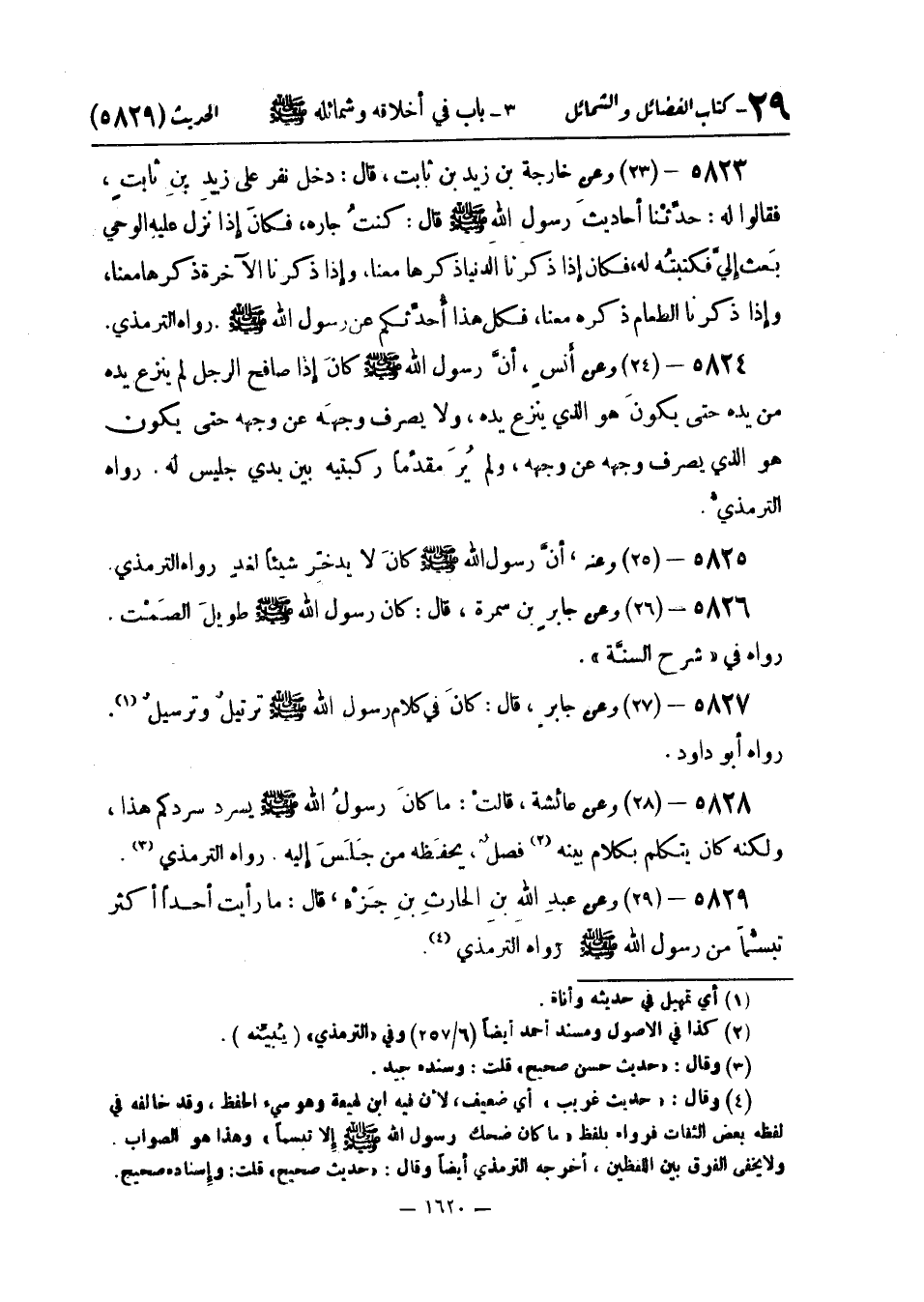 أَنَّ رَسُولَ اللَّهِ صَلَّى اللَّهُ عَلَيْهِ وَسَلَّمَ كَانَ إِذَا صَافَحَ الرَّجُلَ لَمْ يَنْزِعْ يَدَهُ مِنْ يَدِهِ حَتَّى يَكُونَ هُوَ الَّذِي يَنْزِعُ يَدَهُ وَلَا يَصْرِفُ وَجْهَهُ عَنْ وَجْهِهِ حَتَّى يَكُونَ هُوَ الَّذِي يَصْرِفُ وَجْهَهُ عَن وَجهه وَلم يُرَ مقدِّماً رُكْبَتَيْهِ بَين يَدي جليس لَهُ. رَوَاهُ التِّرْمِذِيّ