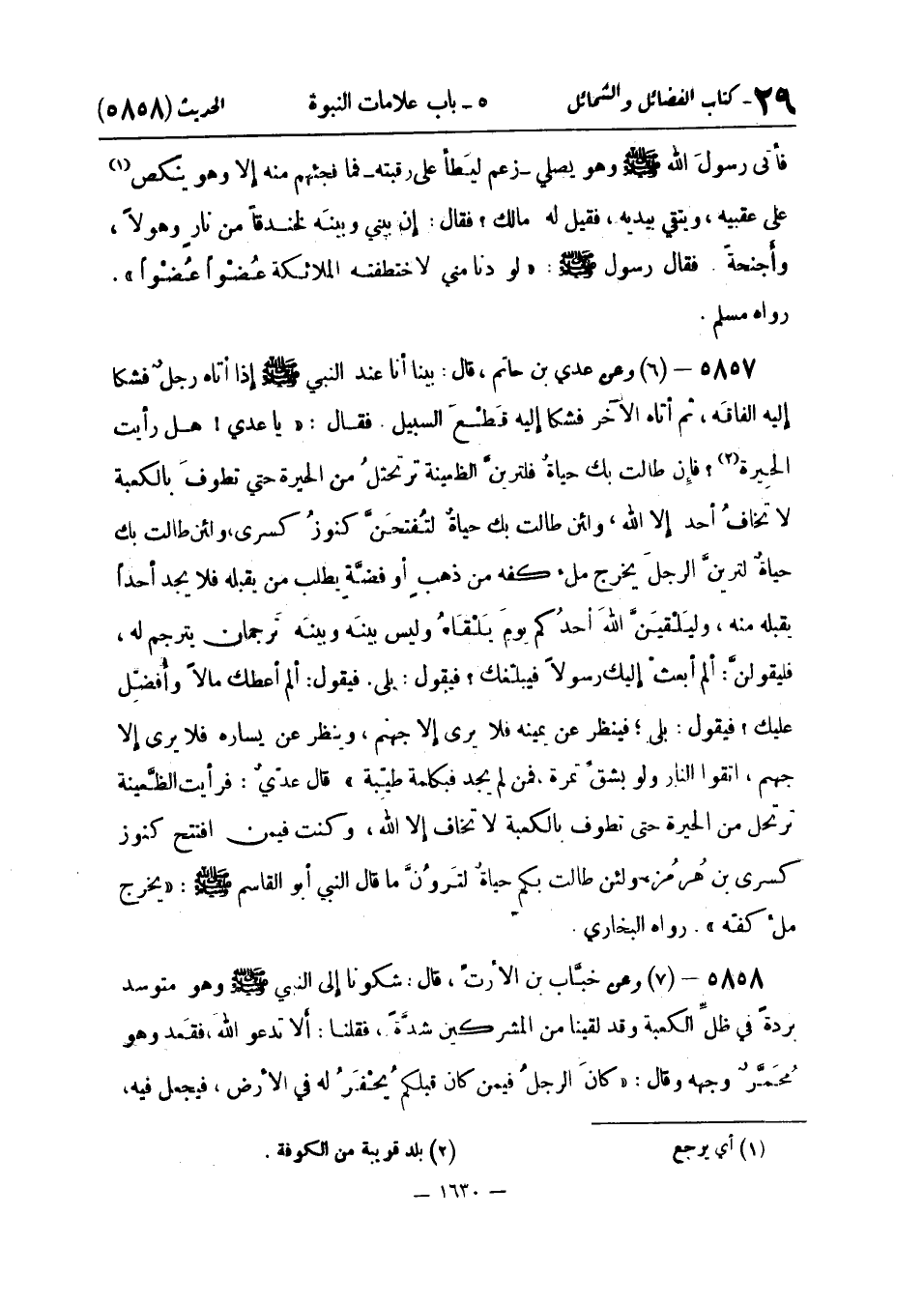 وَعَنْ عَدِيِّ بْنِ حَاتِمٍ قَالَ: بَيْنَا أَنَا عِنْد النَّبِيُّ صَلَّى اللَّهُ عَلَيْهِ وَسَلَّمَ إِذَا أَتَاهُ رَجُلٌ فَشَكَا إِلَيْهِ الْفَاقَةَ ثُمَّ أَتَاهُ الْآخَرُ فَشَكَا إِلَيْهِ قَطْعَ السَّبِيلِ. فَقَالَ: " يَا عدي هَل رَأَيْتَ الْحِيرَةَ؟ فَإِنْ طَالَتْ بِكَ حَيَاةٌ فَلَتَرَيَنَّ الظَّعِينَةَ تَرْتَحِلُ مِنَ الْحِيرَةِ حَتَّى تَطُوفَ بِالْكَعْبَةِ لَا تَخَافُ أَحَدًا إِلَّا اللَّهَ وَلَئِنْ طَالَتْ بك حَيَاةٌ لَتُفْتَحَنَّ كُنُوزُ كِسْرَى وَلَئِنْ طَالَتْ بِكَ حَيَاةٌ لَتَرَيَنَّ الرَّجُلَ يَخْرُجُ مِلْءَ كَفِّهِ مِنْ ذَهَبٍ أَوْ فِضَّةٍ يَطْلُبُ مَنْ يَقْبَلُهُ فَلَا يجد أحدا يقبله مِنْهُ وَلَيَلْقَيَنَّ اللَّهَ أَحَدُكُمْ يَوْمَ يَلْقَاهُ وَلَيْسَ بَيْنَهُ وَبَيْنَهُ تَرْجُمَانٌ يُتَرْجِمُ لَهُ فَلَيَقُولَنَّ: أَلَمْ أَبْعَثْ إِليك رَسُولا فليبلغك؟ فَيَقُولُ: بَلَى. فَيَقُولُ: أَلَمْ أُعْطِكَ مَالًا وَأُفْضِلْ عَلَيْكَ؟ فَيَقُولُ: بَلَى فَيَنْظُرُ عَنْ يَمِينِهِ فَلَا يَرَى إِلَّا جَهَنَّمَ وَيَنْظُرُ عَنْ يَسَارِهِ فَلَا يَرَى إِلَّا جَهَنَّمَ اتَّقُوا النَّارَ وَلَوْ بِشِقِّ تَمْرَةٍ فَمَنْ لَمْ يَجِدْ فَبِكَلِمَةٍ طَيِّبَةٍ " قَالَ عَدِيٌّ: فَرَأَيْتُ الظَّعِينَةَ تَرْتَحِلُ مِنَ الْحِيرَةِ حَتَّى تَطُوفَ بِالْكَعْبَةِ لَا تَخَافُ إِلَّا اللَّهَ وَكُنْتُ فِيمَنِ افْتَتَحَ كُنُوزَ كِسْرَى بْنِ هُرْمُزَ وَلَئِنْ طَالَتْ بِكُمْ حَيَاةٌ لَتَرَوُنَّ مَا قَالَ النَّبِيُّ أَبُو الْقَاسِمِ صَلَّى اللَّهُ عَلَيْهِ وَسَلَّمَ: «يَخْرُجُ ملْء كفيه» . رَوَاهُ البُخَارِيّ